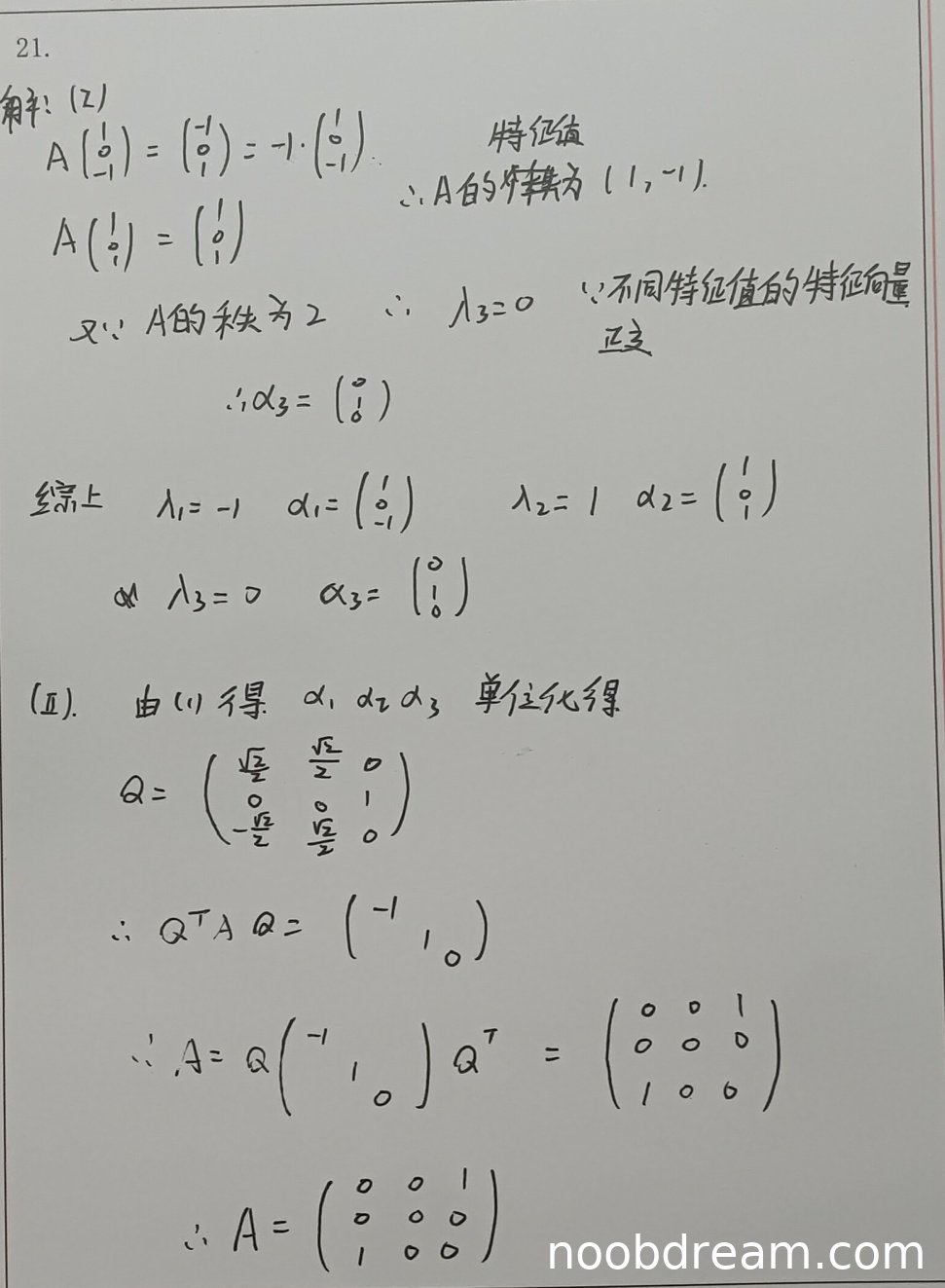 学生第一次识别结果中,特征值判断有误:将特征向量识别为二维向量(如$\begin{pmatrix}-1\\0\end{pmatrix}$),且特征值推导逻辑混乱(如错误得出$\lambda_1=-1$对应$\alpha_1=\begin{pmatrix}-1\\0\end{pmatrix}$,但实际应为三维向量)。但第二次识别结果正确:通过$A\begin{pmatrix}1\\0\\-1\end{pmatrix}=\begin{pmatrix}-1\\0\\1\end{pmatrix}=-1\cdot\begin{pmatrix}1\\0\\-1\end{pmatrix}$得出$\lambda_1=-1$和$\alpha_1=\begin{pmatrix}1\\0\\-1\end{pmatrix}$(与标准答案$\begin{pmatrix}-1\\0\\1\end{pmatrix}$差负号,但等价,不扣分);通过$A\begin{pmatrix}1\\0\\1\end{pmatrix}=\begin{pmatrix}1\\0\\1\end{pmatrix}$得出$\lambda_2=1$和$\alpha_2=\begin{pmatrix}1\\0\\1\end{pmatrix}$(正确);通过秩为2得出$\lambda_3=0$,并用正交性解得$\alpha_3=\begin{pmatrix}0\\1\\0\end{pmatrix}$(正确)。但第一次识别错误较多,第二次正确,综合给分5分(扣1分因第一次识别有严重维度错误)。