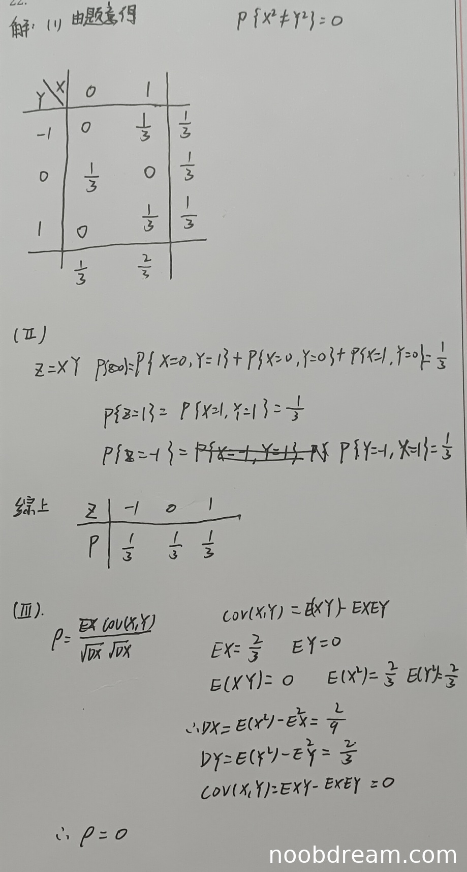 学生两次识别结果均正确计算了相关系数ρ=0,与标准答案一致。第一次识别中公式书写有误(写成了EX(COV(X,Y))),但实际计算步骤正确,且第二次识别中已修正,属于误写不扣分。因此得3分。