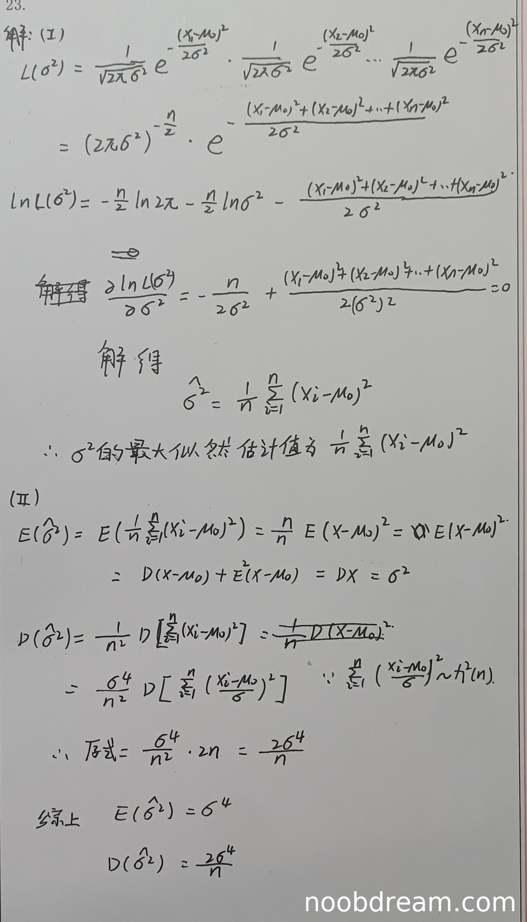 第1次识别中,学生正确写出了似然函数和对数似然函数,并对参数求导令导数为零,得到最大似然估计为 \(\hat{\sigma}^{2} = \frac{1}{n}\sum_{i=1}^{n}(x_i - \mu_0)^2\),与标准答案一致。但存在字符识别问题,如将 \(\mu_0\) 误写为 \(M_0\),但根据上下文判断为误写,不扣分。第2次识别中,过程完整且正确。因此得满分5.5分。