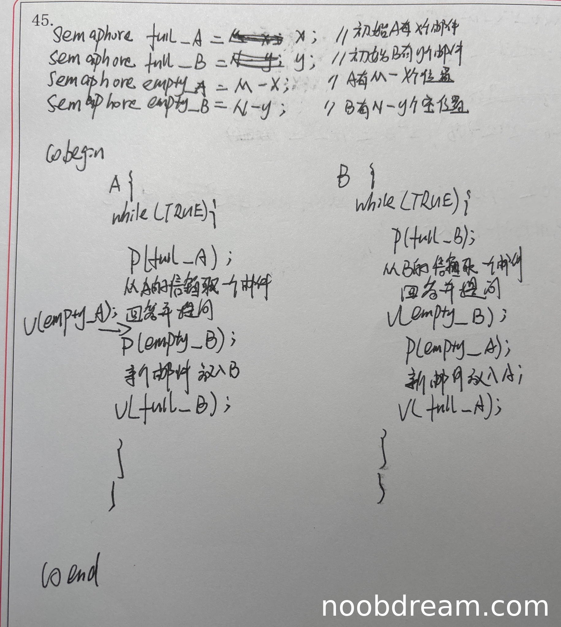 理由:学生定义了四个同步信号量(full_A, full_B, empty_A, empty_B)并正确设置了初值(x, y, M-x, N-y),与标准答案一致。信号量含义清晰,初值正确。