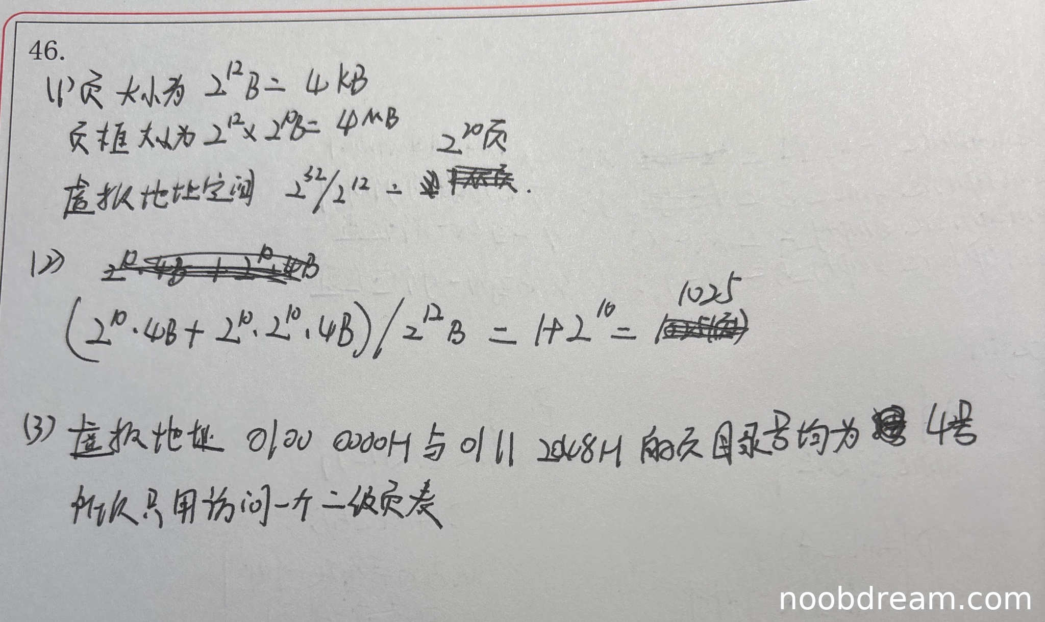 学生答案中,页大小计算正确(4KB),虚拟地址空间页数计算正确(2^20页)。但页框大小计算错误(误写为4MB,实际应为4KB)。由于页框大小与页大小相同,此处存在逻辑错误。但根据禁止扣分规则,识别结果中“页框大小为$2^{12}\times2^{10}B=4MB$”可能是误写(因为$2^{12}\times2^{10}$是错误表达式,实际应为$2^{12}B$),且上下文正确部分(页大小)得分,因此扣1分。得分:1分。