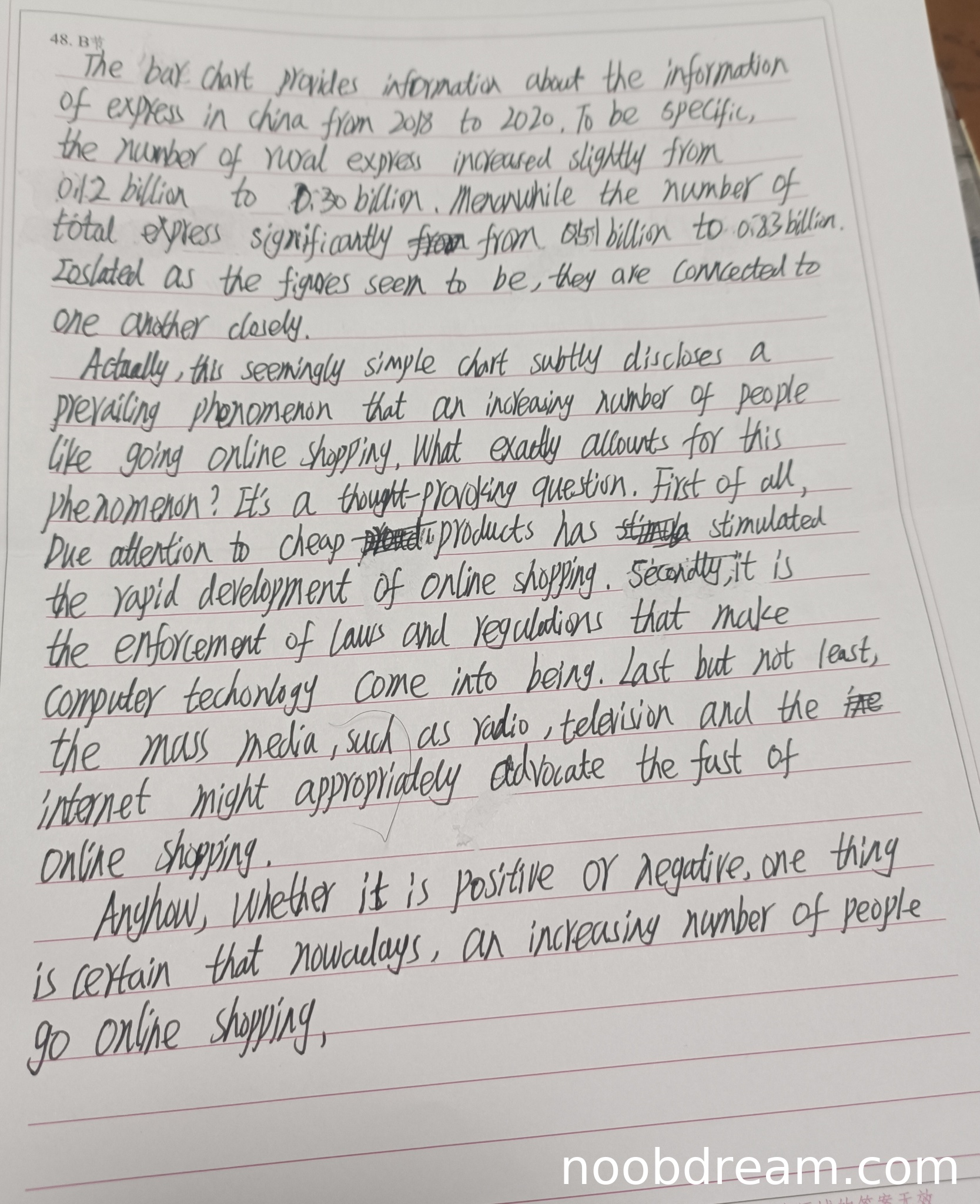 理由:学生基本完成了图表解读任务,但存在明显问题。第一次识别中"road express"和"0.023 billion"(应为0.83 billion)的数据错误,第二次识别修正为"rural express"和正确数据,但单位"billion"使用错误(应为十亿件,但图表数值为百分比)。学生正确识别了总体和农村快递数据的增长趋势,但未准确说明这是"快递业务量占比"(图表纵轴为百分比)。评论部分虽然讨论了网购现象,但与图表主题关联不够紧密,且"laws and regulations make computer technology come into being"等表述存在逻辑问题。漏掉了对城乡差异的分析这一重要内容点。