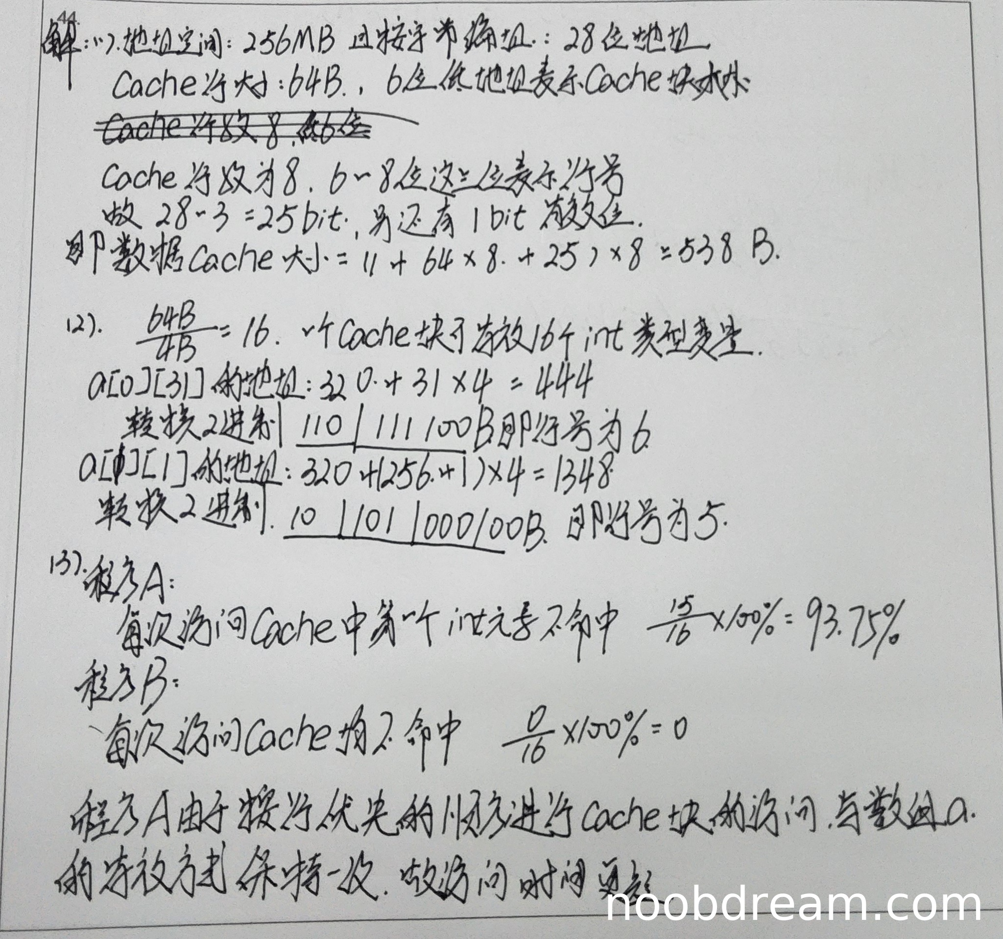 对于a[0][31]的计算:地址320+31×4=444正确,444÷64=6.9375,取整得6,行号6正确。对于a[1][1]的计算:地址320+(256×4+1×4)=1348正确,1348÷64=21.0625,取整得21,21 mod 8 = 5,行号5正确。但学生写a[1][1]地址时误写为"320+(256+1)×4",虽计算结果正确,但表达式不严谨,扣1分。得3分。