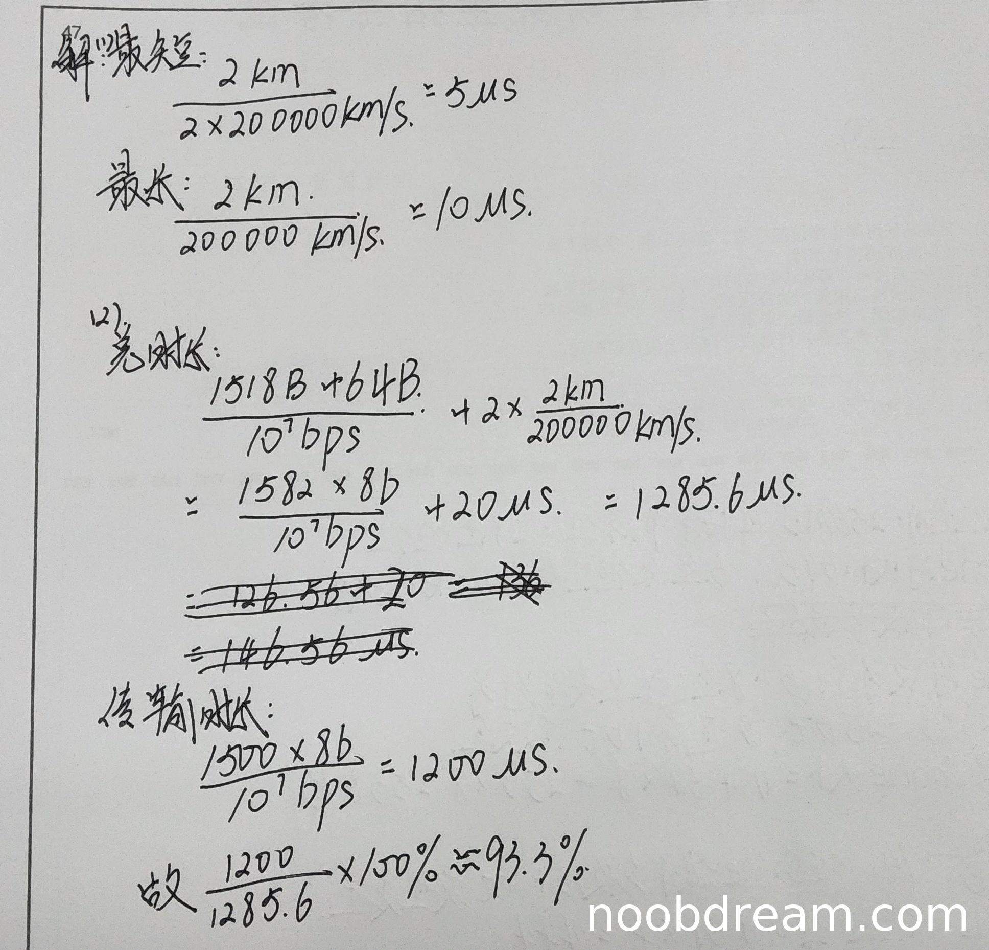 学生答案中,最短时间计算为5μs,标准答案为0.01ms(即10μs),学生计算错误。理由:最短冲突检测时间应为单程传播时延(2km/200000km/s=0.01ms),但学生错误地除以2(公式中分母多乘2),属于逻辑错误。最长时间计算为10μs,与标准答案0.02ms(即20μs)不符。理由:最长时间应为双程传播时延(2×单程时延),但学生仅计算了单程时延,属于逻辑错误。因此(1)部分得0分。