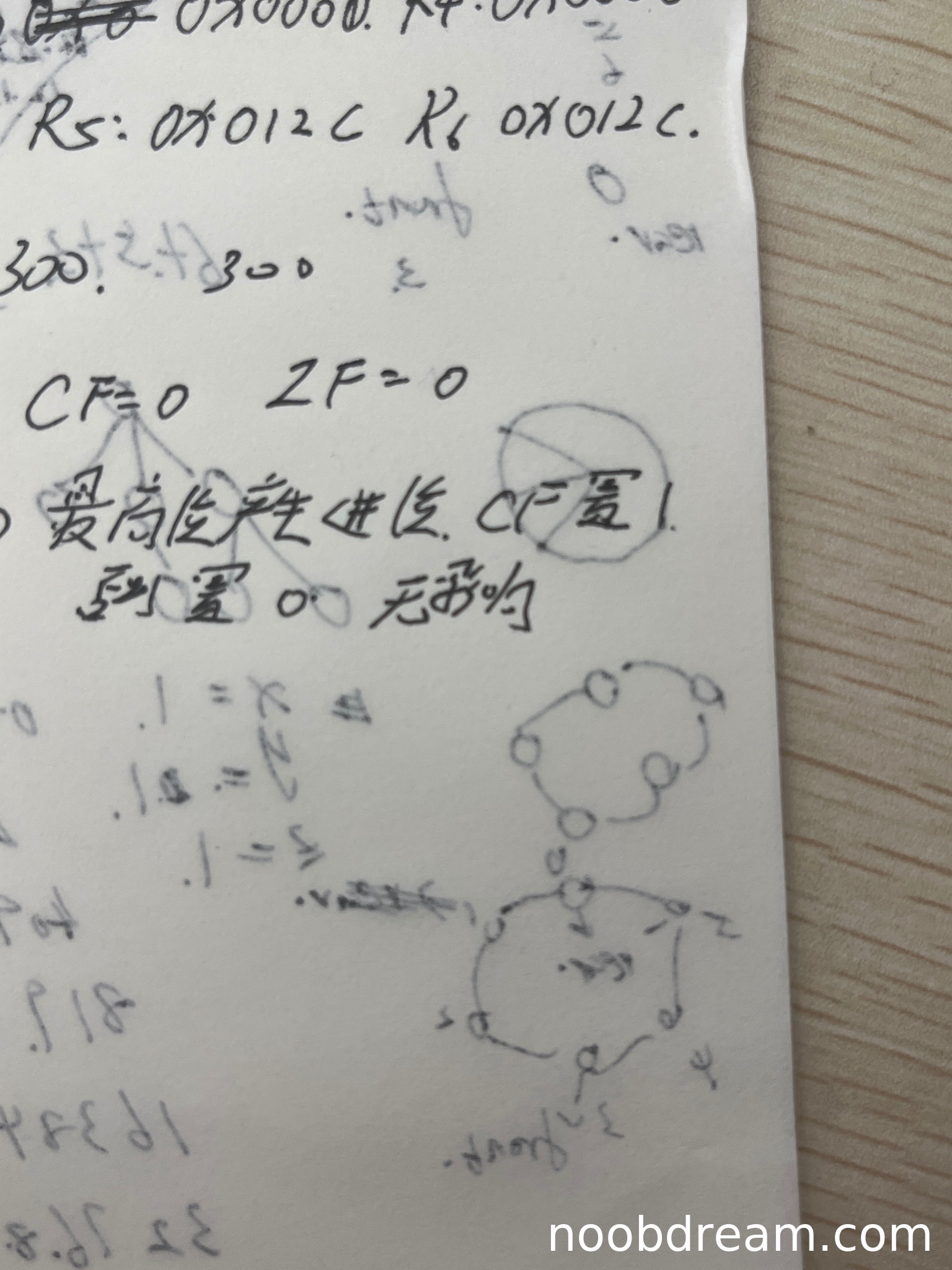 学生答案中给出了“CF = 0 ZF = 0”。对于m2的计算(us1-us2),由于us1 (300) < us2 (65336),减法操作会产生借位,进位标志CF应置1。结果m2=500不为0,零标志ZF应置0。学生答对了ZF=0,但CF=0是错误的。因此,本小题得1分(ZF正确给1分)。