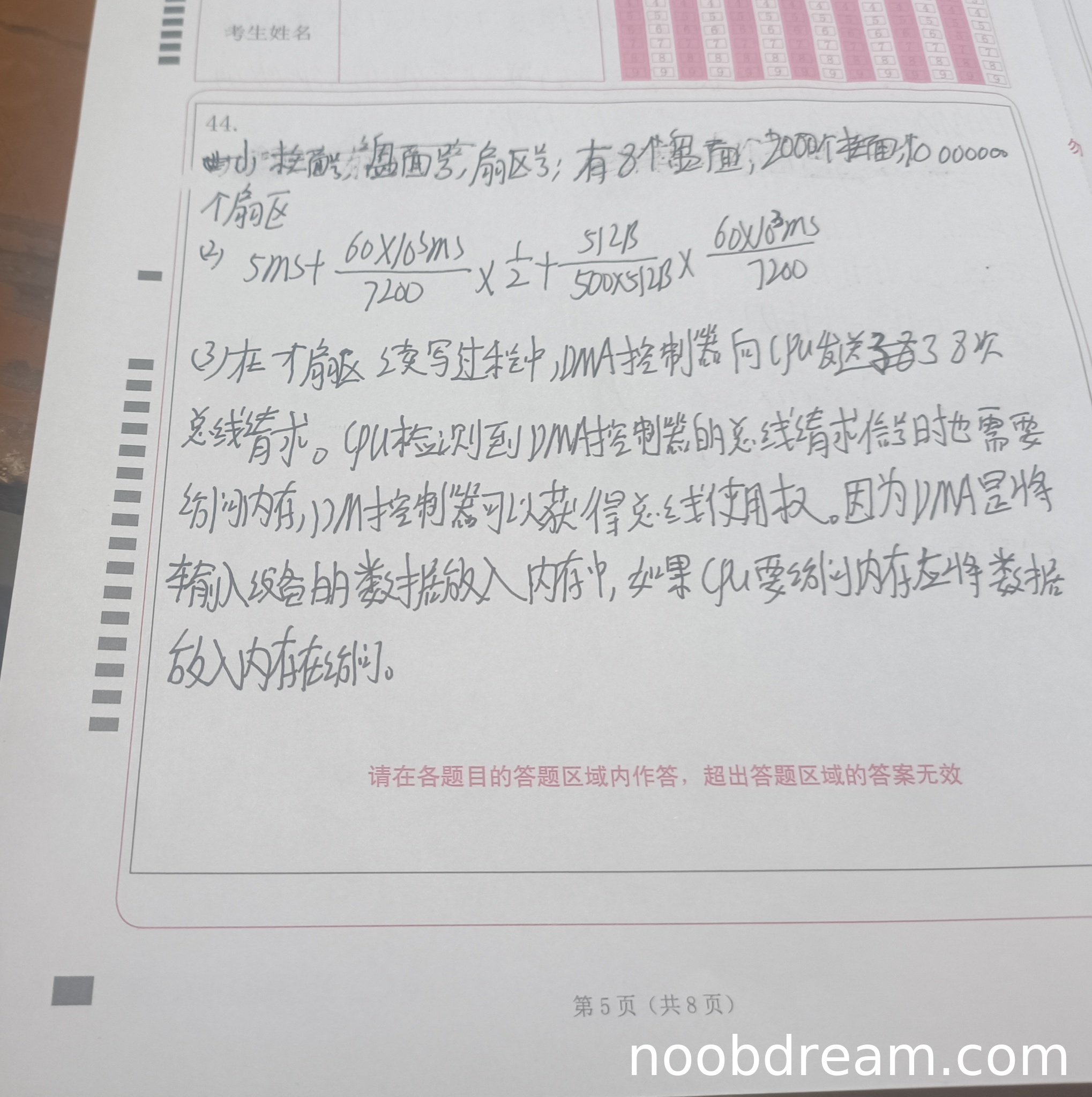 第一问:学生答案中两次识别结果均给出DMA请求次数为8次,但标准答案为64次(512B/64bit=64)。计算逻辑错误,扣1分。