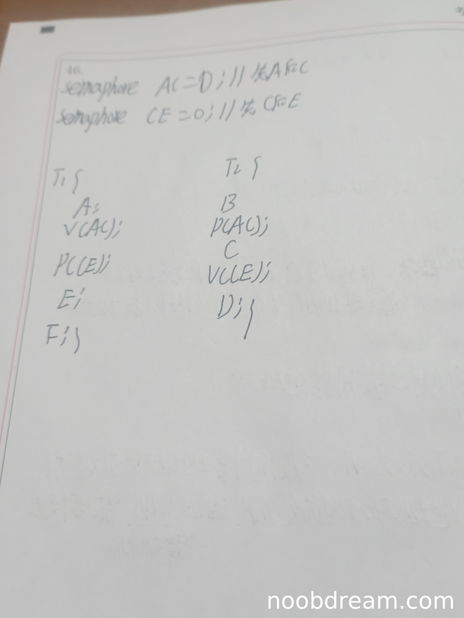 T2中执行B后P(AC)等待A完成,然后执行C,再V(CE)通知E,最后执行D。顺序正确,与标准答案简化方案一致。但缺少对C完成信号的通知(标准答案中C完成后需要通知D和E,但学生方案中D直接在C后执行,未使用信号量,由于D和C在同一线程,可以顺序执行,因此不扣分)。T2同步逻辑正确。得3分。