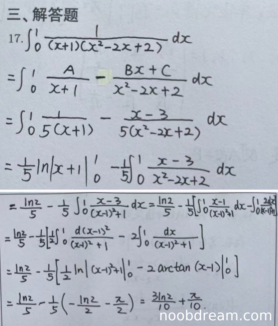 - 第一小项通过变量代换得到 \(\frac{1}{2}\ln|(x-1)^2+1|\),代入上下限时得出 \(-\frac{1}{2}\ln2\) 正确。