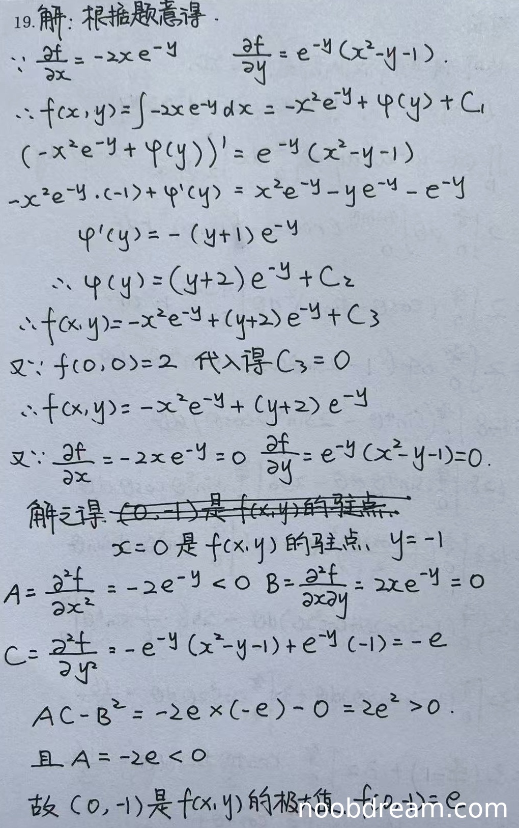 学生正确计算二阶偏导数A、B、C,并代入驻点计算判别式AC-B²>0且A<0,得出极大值结论,计算f(0,-1)=e正确。但在第一次识别结果中,计算C时写为“-e^{-y}(x²-y-1)+e^{-y}(-1)”,实际应为对f_y再求导,标准答案为e^{-y}(x²-y),但代入点后结果正确(-e),属于表达不规范但计算无误。根据“误写不扣分”原则,不扣分。得3分。