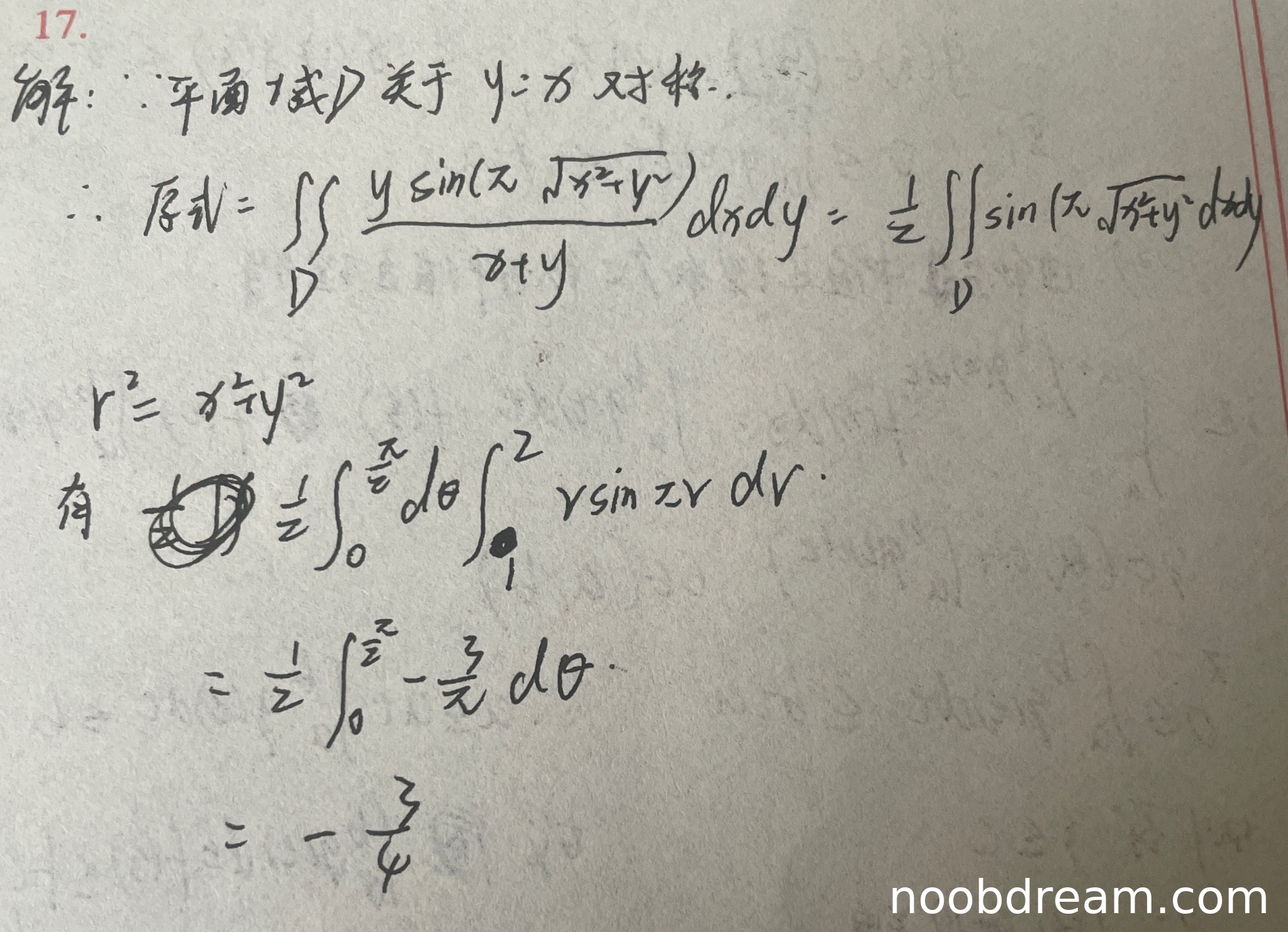 学生正确指出区域D关于y=x对称,并应用轮换对称性得到被积函数的对称形式,从而将原积分转化为二分之一倍的sin项积分。这一步思路正确,与标准答案一致。得2分。