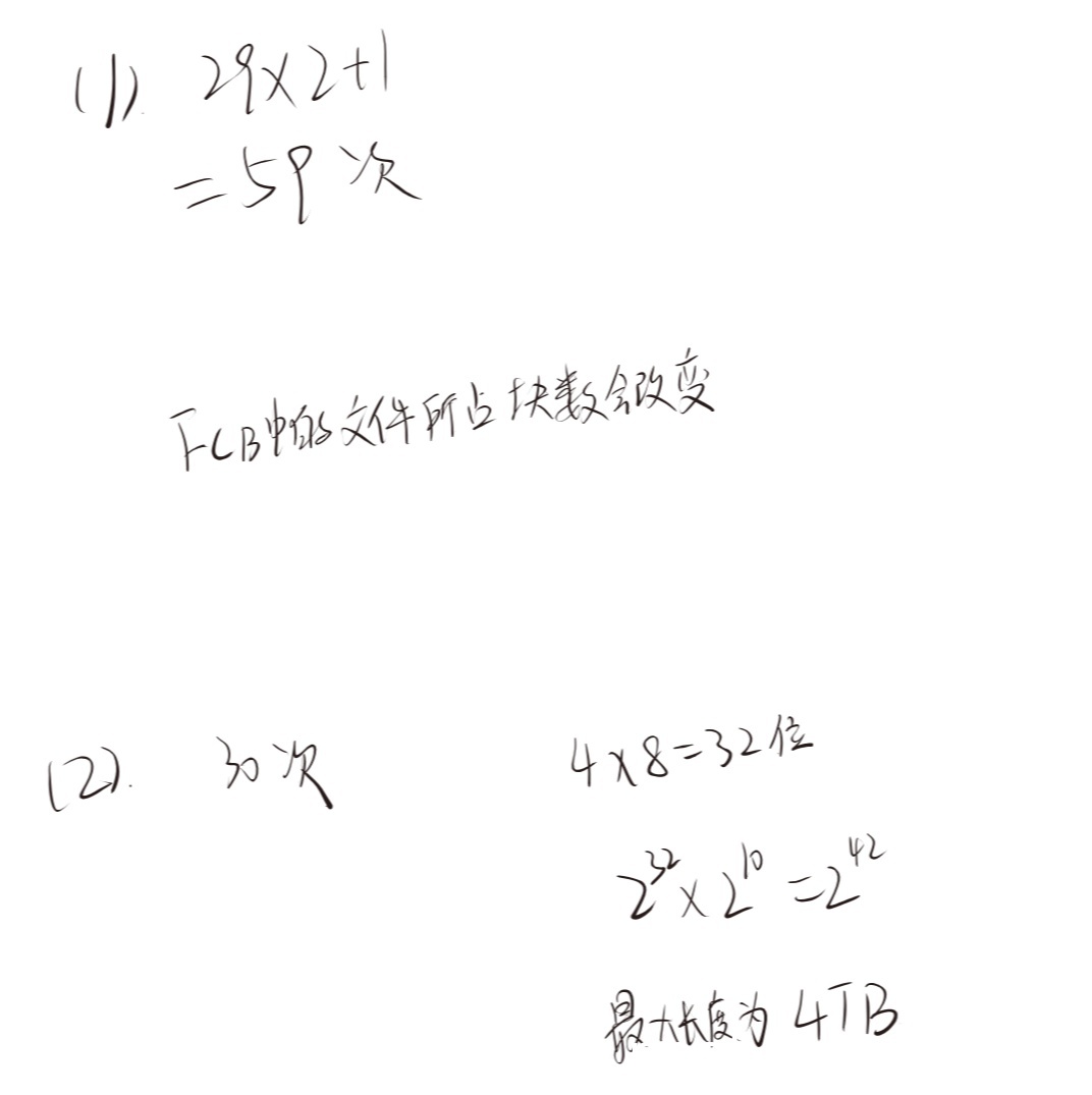 学生答案中计算访盘次数为30次,而标准答案为31次(查找第29块29次+写入新块1次+修改第29块1次)。学生可能忽略了修改原第29块指针并写回磁盘的一次访盘操作,存在逻辑错误,扣1分。对于最大文件长度的计算,学生得出4TB,而标准答案为4080GB。学生计算过程为2³²×2¹⁰=2⁴²B=4TB,这是将整个磁盘块(1KB)都用于数据计算,但实际每个块中只有1020B用于数据(4B用于指针)。学生未考虑指针占用的空间,存在逻辑错误,扣1分。本小题得分为2分。