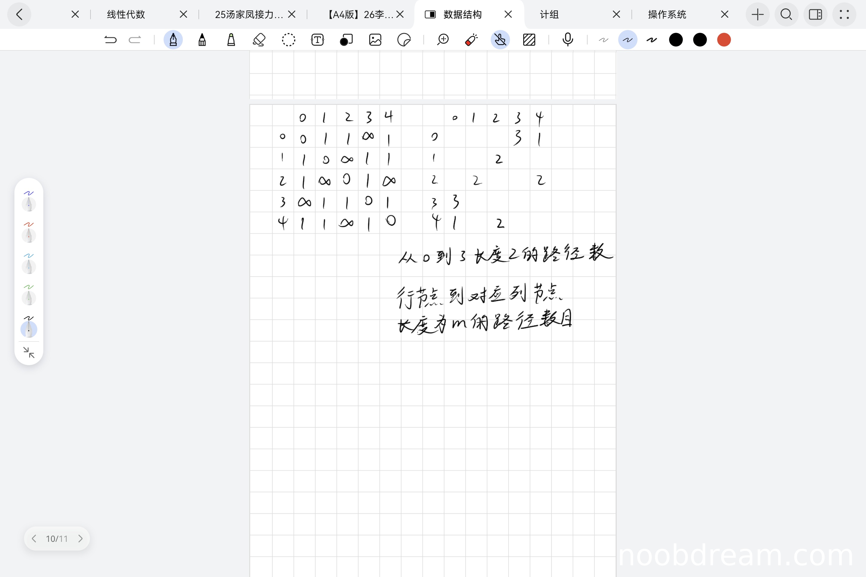 学生未计算A²,但回答了“从0到3长度2的路径数”,这与标准答案中“从顶点0到顶点3之间长度为2的路径共有3条”的核心含义一致,即正确指出了该元素的含义。因此,该部分得分为3分。