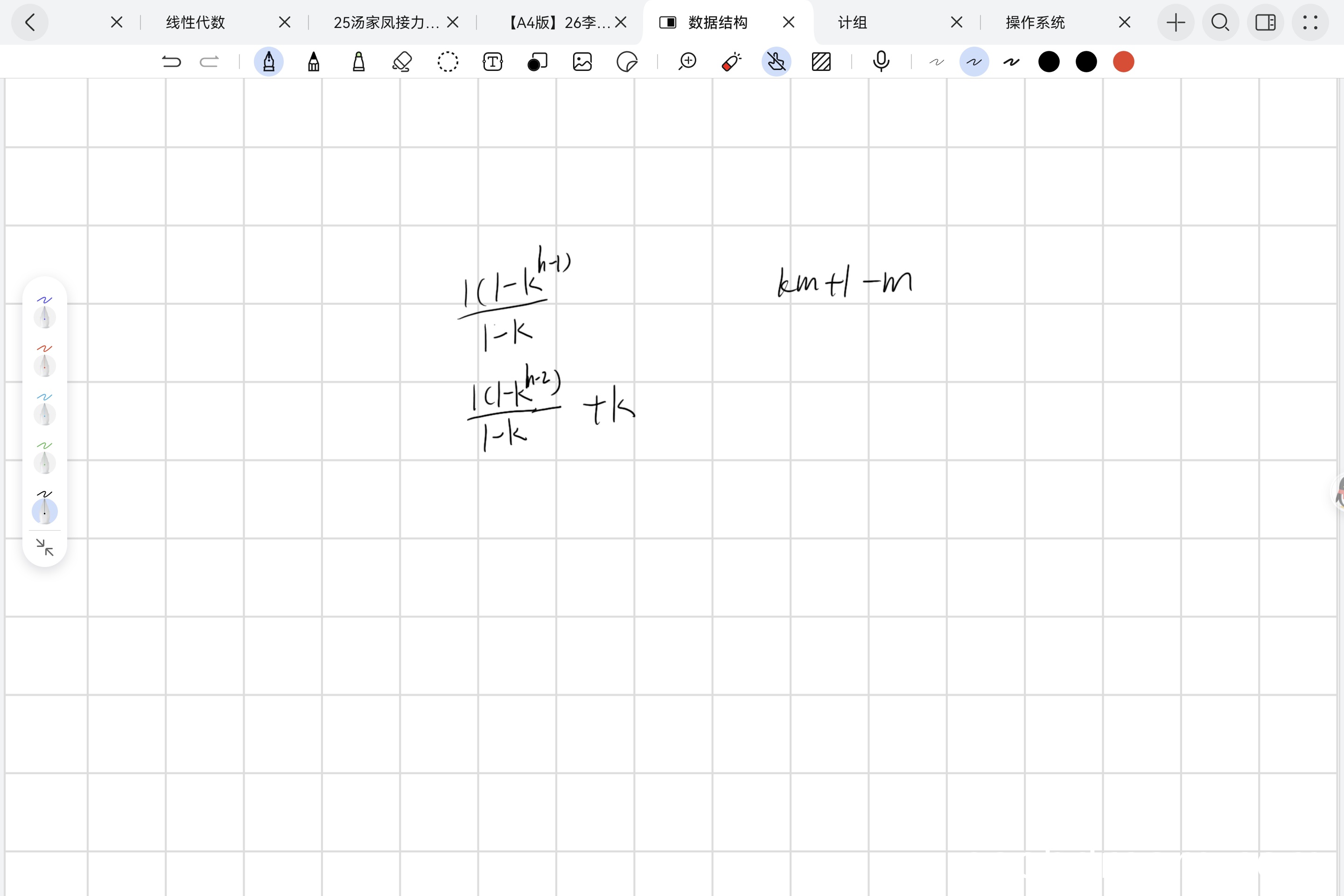学生给出的第三个式子为 \(km + l - m\),而标准答案为 \(n_0 = (k-1)m + 1\)。学生的式子中使用了变量 \(l\),但未定义其含义。如果假设 \(l\) 代表叶结点数 \(n_0\),则式子可写为 \(l = km + l - m\),化简后得 \(0 = km - m\),即 \(m(k-1) = 0\),这显然不正确(除非 \(k=1\) 或 \(m=0\),但题目中 \(k \ge 2\) 且树非空)。因此,学生的答案在逻辑上是错误的,未能正确推导叶结点数。但考虑到学生可能意图表达 \(n_0 = km - m + 1\)(即标准答案形式),但书写有误或识别错误,根据“误写不扣分”原则,需谨慎判断。然而,式子结构明显偏离标准形式,且未提供推导过程,根据评分说明“仅给出结果无推导过程最高得2分”,但此处结果错误,故不得分。