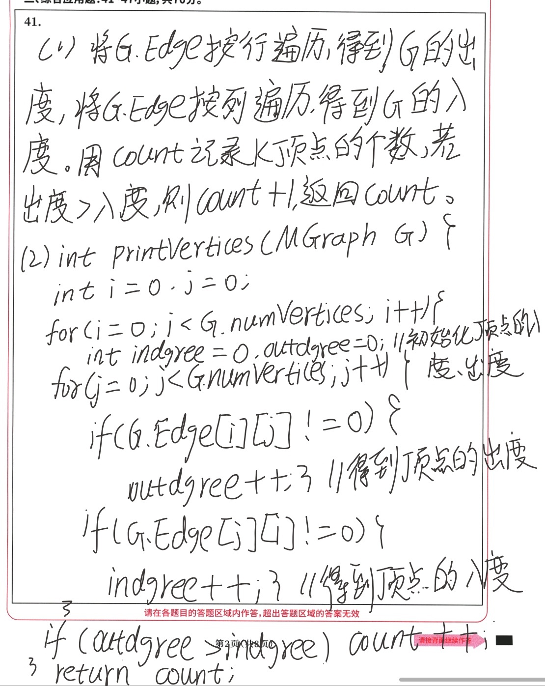 2. 注释中"得到j顶点的出度"应为"得到i顶点的出度",但这是注释笔误,不影响逻辑,不扣分。