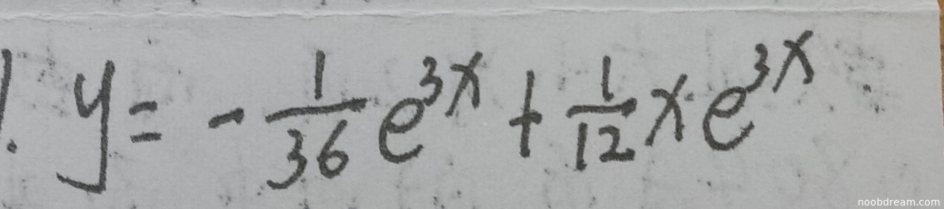 学生两次识别结果均为 \(y = -\frac{1}{36}e^{3x} + \frac{1}{12}xe^{3x}\)。该表达式与标准答案 \(y(x) = \frac{1}{12}(xe^{3x} - \frac{1}{3}e^{3x})\) 等价,因为 \(\frac{1}{12} \times (-\frac{1}{3}) = -\frac{1}{36}\),且展开后形式一致。答案满足微分方程和初始条件,核心逻辑正确。因此得5分。