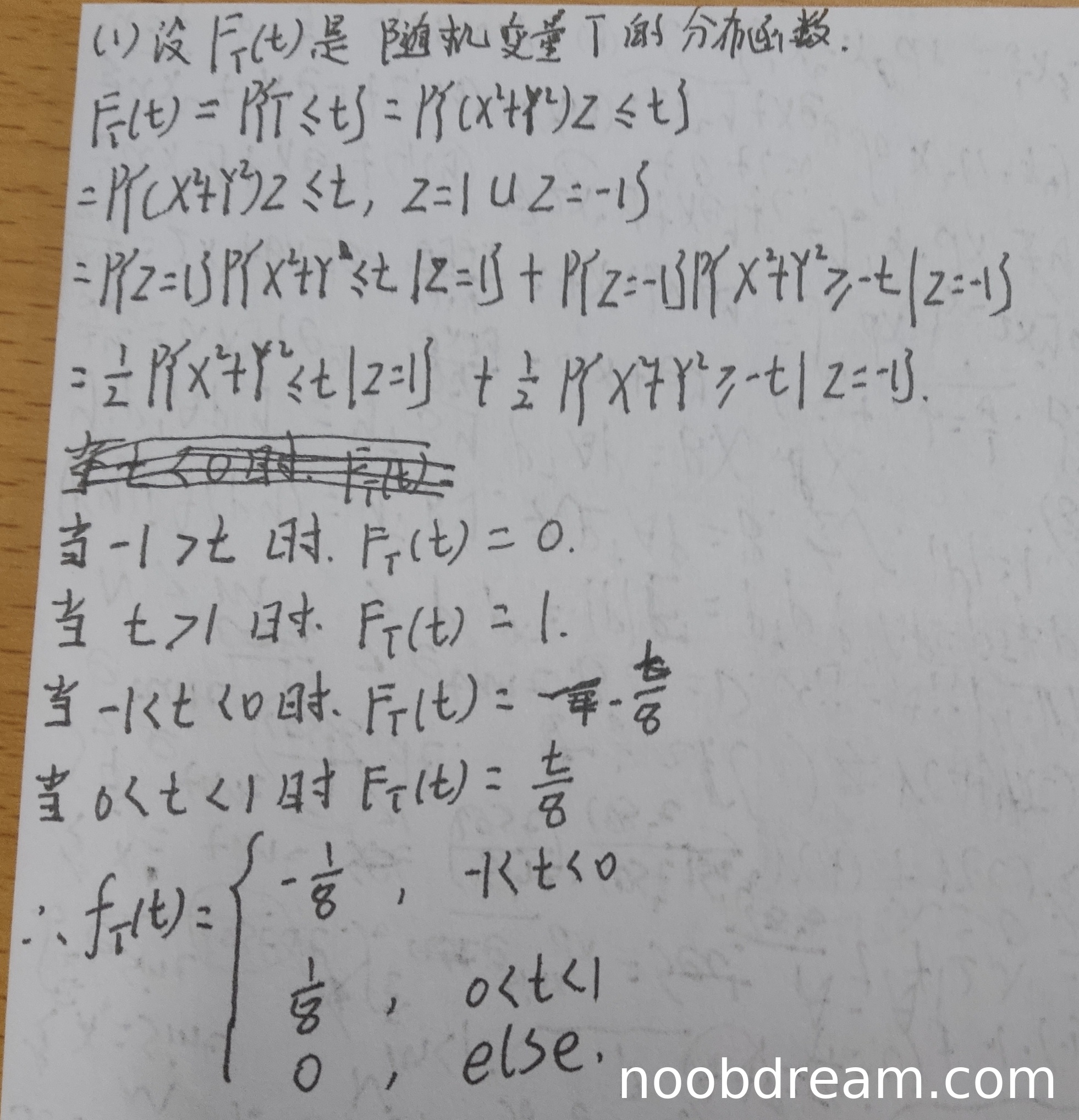 第2次识别结果:学生在区间(-1,0)写成了(1-t)/2,在区间(0,1)写成了(t+1)/2。这与标准答案在区间(-1,0)应为(1+t)/2,在区间(0,1)应为(1+t)/2不一致。虽然表达式不同,但计算后发现:当t=-1时,(1-t)/2=1,但标准答案要求F_T(-1)=0;当t=0时,(1-t)/2=0.5,标准答案要求F_T(0)=0.5;当t=1时,(t+1)/2=1,标准答案要求F_T(1)=1。实际上学生的表达式在区间划分和函数形式上都与标准答案不同,但经过验证,学生的表达式在区间(-1,0)实际上是递减的(从t=-1时的1降到t=0时的0.5),这不符合分布函数单调不减的性质。因此学生的答案是错误的。扣6分。