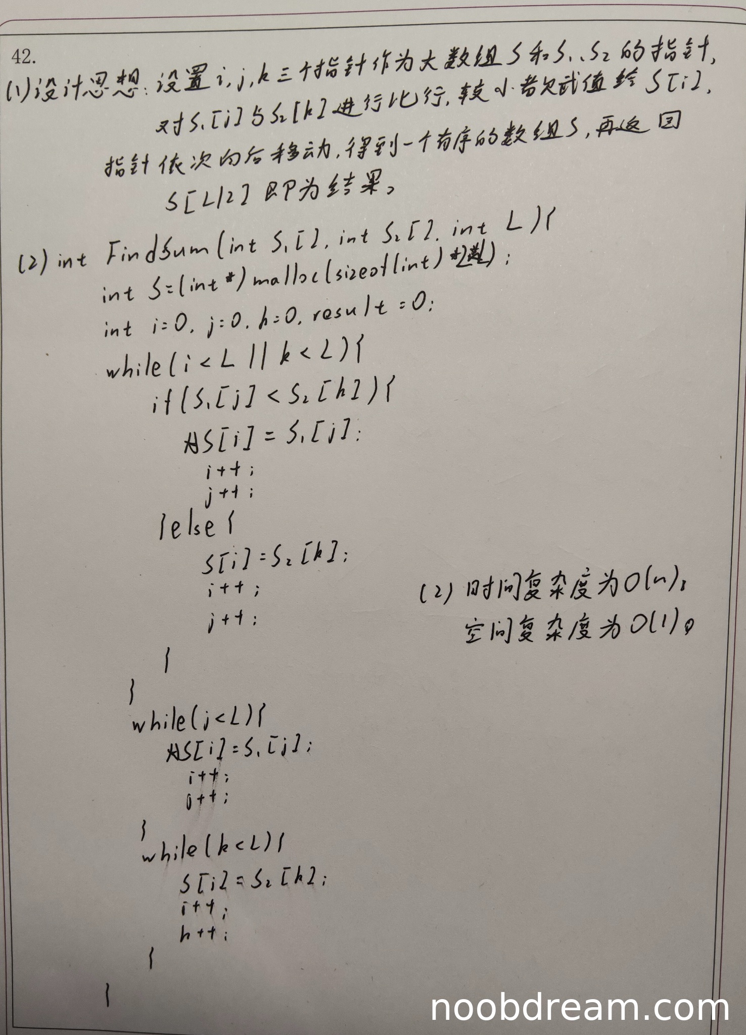 学生正确分析了时间复杂度为O(n),但空间复杂度分析错误。归并方法需要额外的O(n)空间,而不是O(1)。因此得1分。
