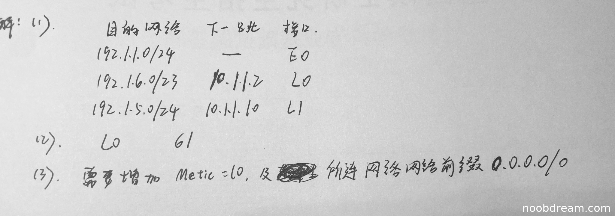 学生两次识别结果均正确指出需要增加前缀"0.0.0.0/0"和Metric=10,与标准答案一致。第二次识别中"Metic"可能是"Metric"的识别错误,但根据禁止扣分规则,不扣分。因此,本小题得1分。