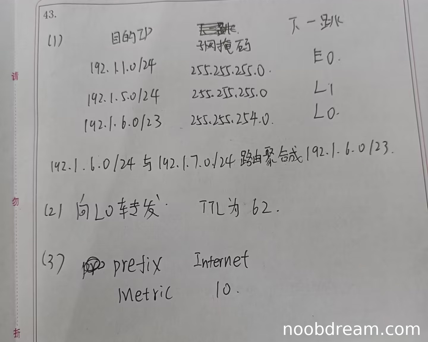 学生回答“prefix Internet Metric 10”,虽然表述不完整(未写出具体前缀0.0.0.0/0),但提到了prefix和metric,且metric值正确。考虑到题目要求“增加哪些信息”,学生答出了关键信息,可以认为基本正确,得1分。