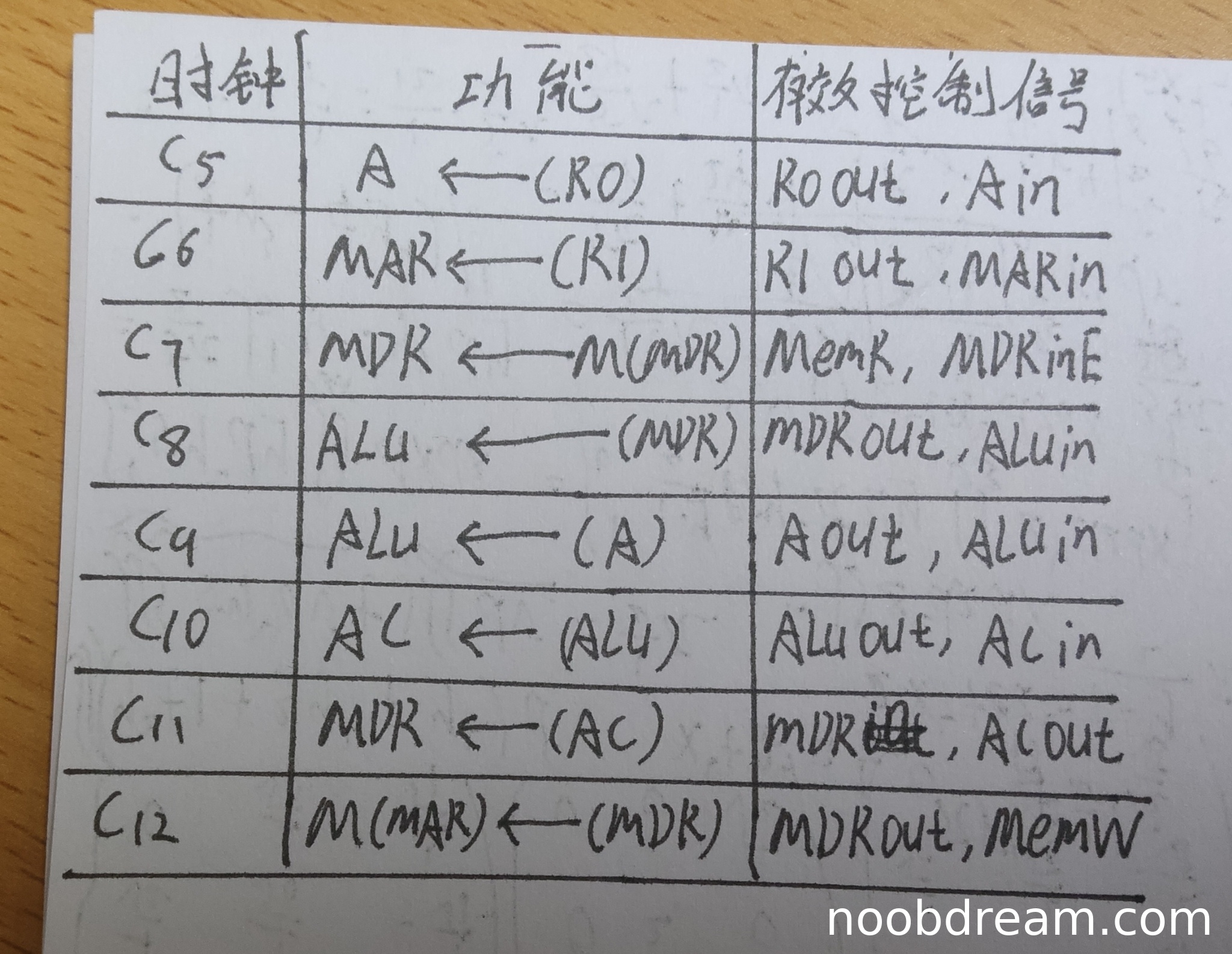 正确部分:C5、C6节拍功能正确(先取R0到A,再取R1到MAR),C12节拍写回功能正确。但核心的取数、加法和存数逻辑存在根本性错误。
