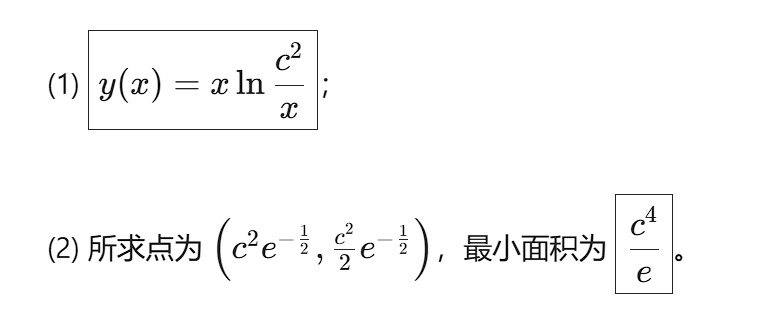 学生答案:点 (c² e^{-1/2}, c²/2 e^{-1/2}),最小面积 c⁴/e。