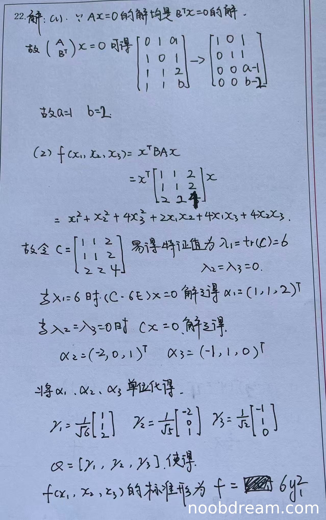 学生正确计算了BA矩阵,识别出矩阵的秩为1,特征值为6,0,0。但在求特征向量时存在逻辑错误:学生求得的α₂和α₃不正交(内积为2≠0),而正交变换要求特征向量正交。虽然最终标准形正确(6y₁²),但Q不是正交矩阵。这是一个重要的逻辑错误,扣3分。另外,学生正确写出了二次型的矩阵表达式和标准形,给予部分分数。最终得3分。