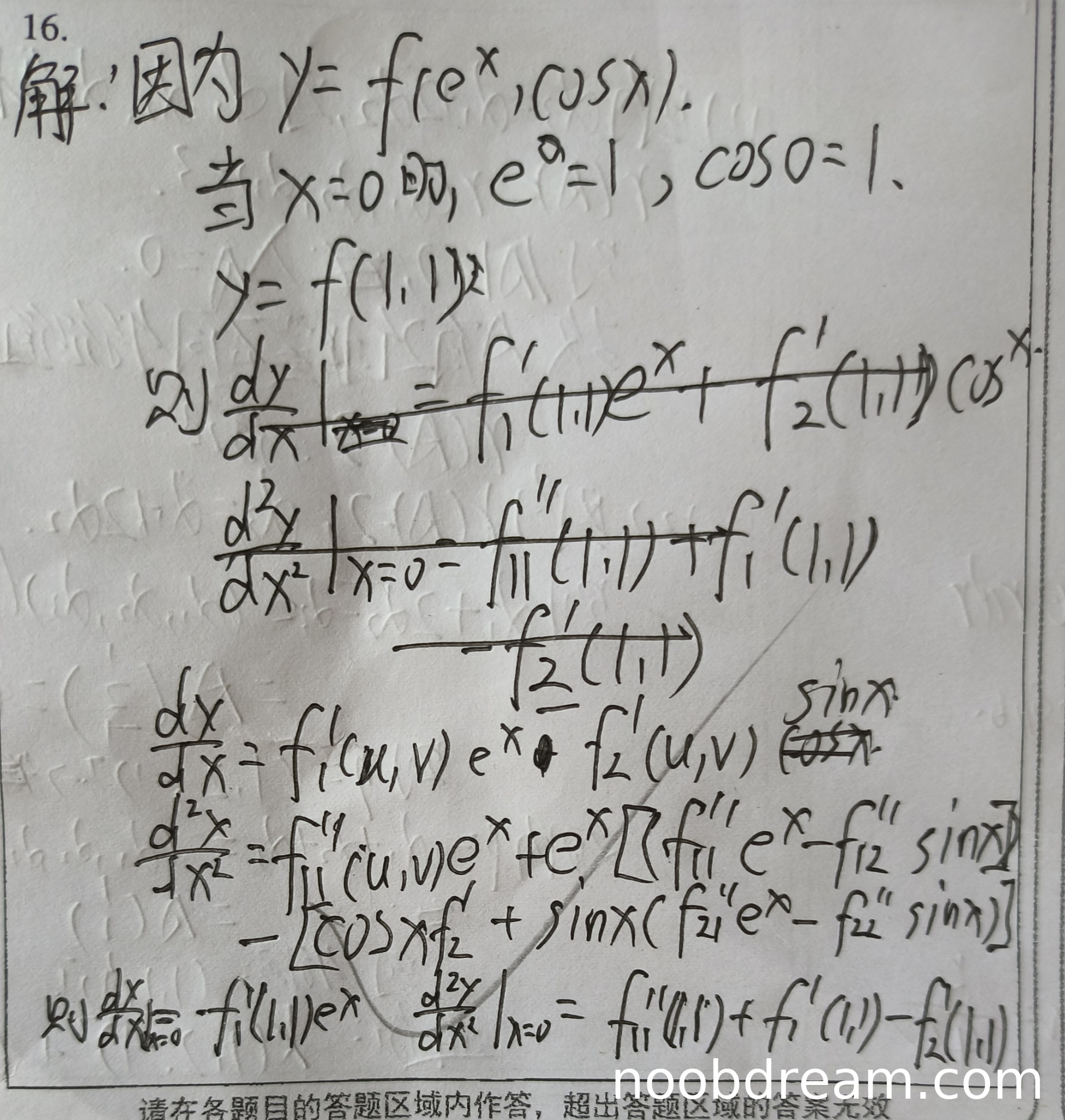 学生第一次识别结果中,计算一阶导数时写为 \(\left.\frac{dy}{dx}\right|_{x=0}=f_{1}'(1,1)e^{x}+f_{2}'(1,1)\cos x\),这明显是错误的,因为求导后没有代入 \(x=0\),且表达式含有 \(x\)。但第二次识别结果中,学生正确写出了 \(\frac{dy}{dx}=f_{1}'(u,v)e^{x}+f_{2}'(u,v)(-\sin x)\),并在最后给出 \(\left.\frac{dy}{dx}\right|_{x=0}=f_{1}'(1,1)e^{x}\),这里虽然多写了 \(e^{x}\),但根据上下文可能是误写(因为 \(e^{0}=1\)),且最终数值结果与标准答案一致。考虑到识别可能出错,且核心逻辑正确,扣1分。