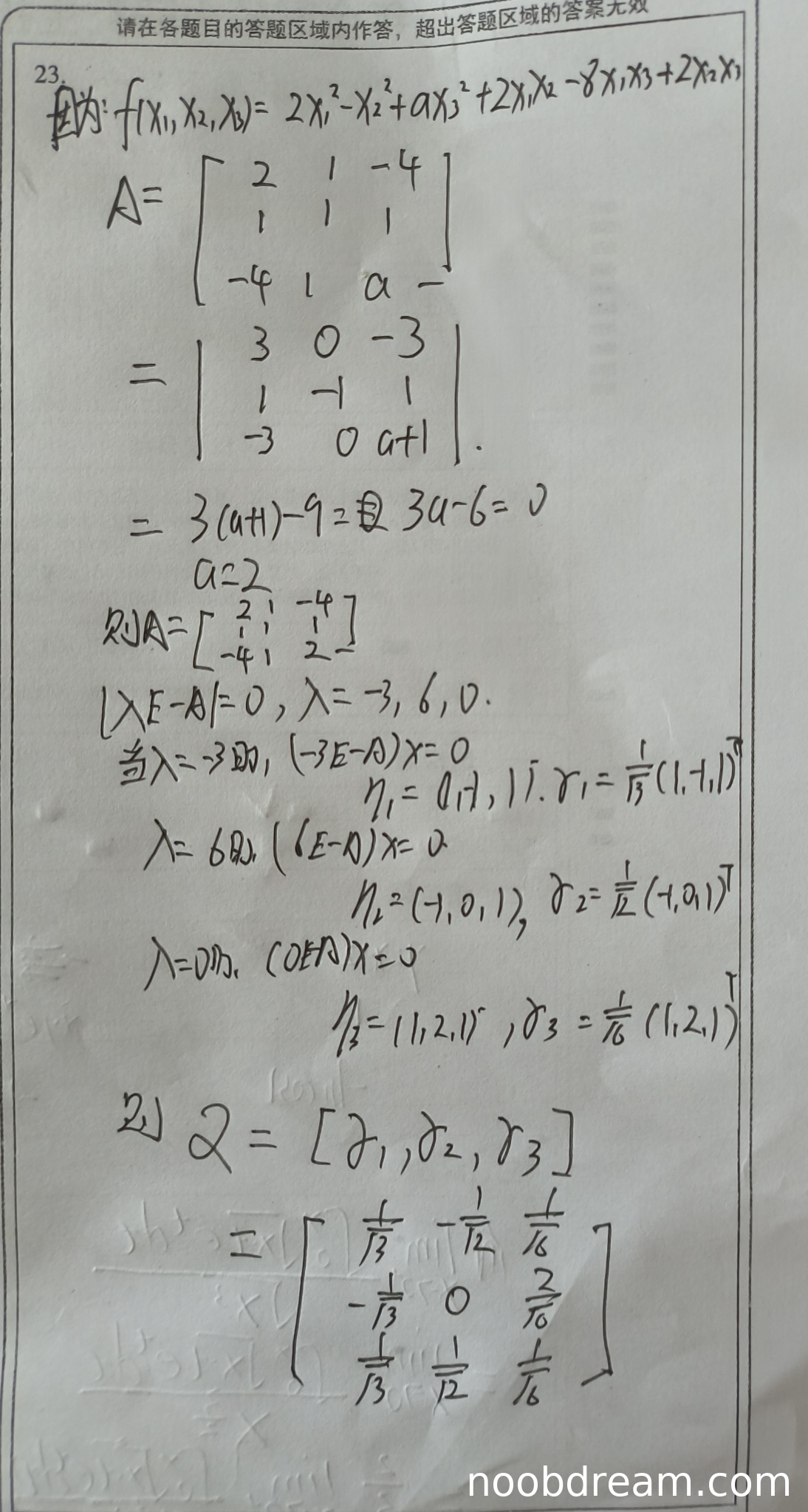 学生正确计算特征多项式并得到特征值λ=-3,6,0。第一次识别中特征值计算过程不完整,但第二次识别完整正确。根据识别规则,不扣分。