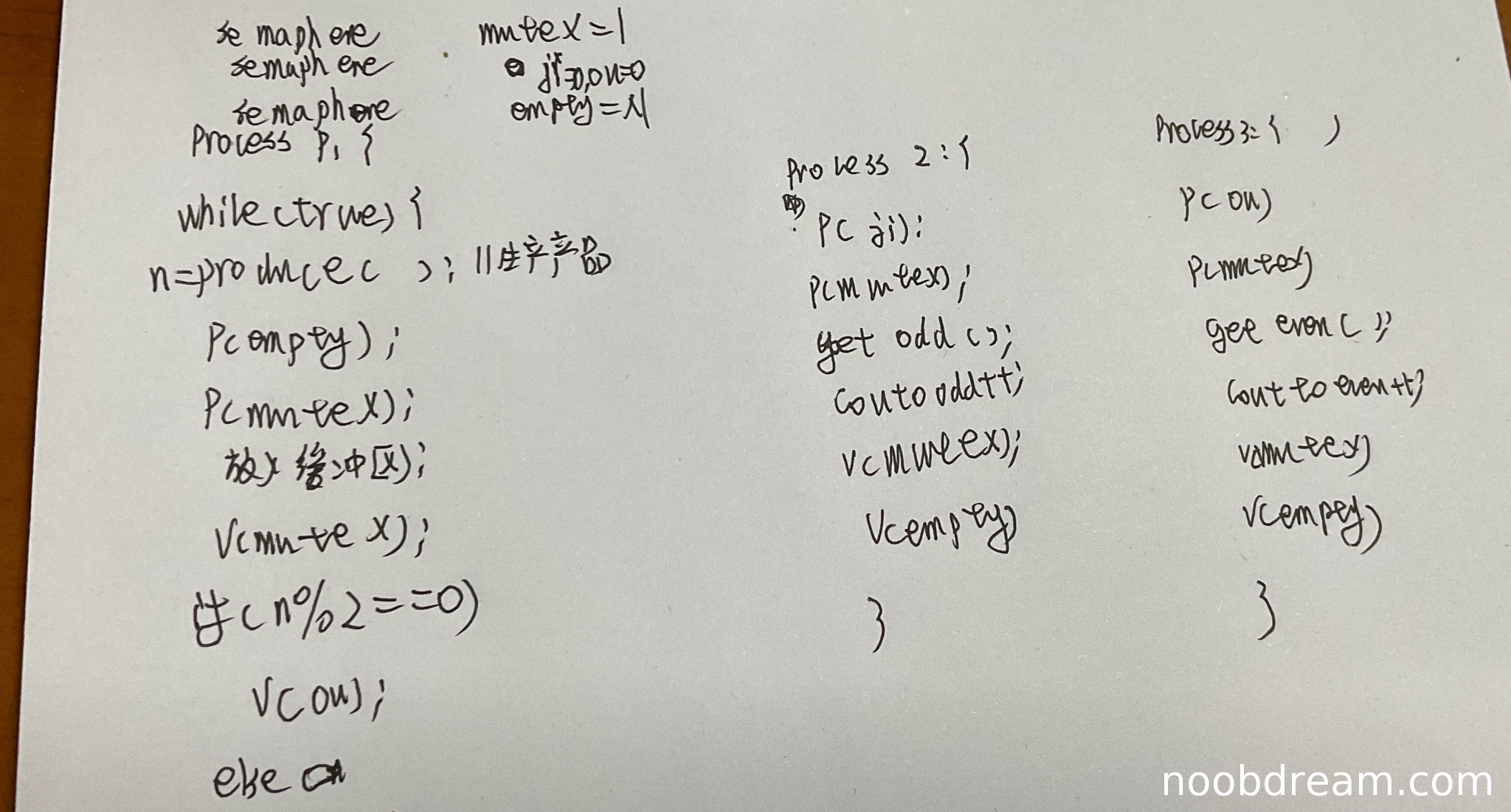 理由:P1进程的逻辑正确。先生产数据,然后P(empty)检查缓冲区空间,再P(mutex)进入临界区进行put操作,之后V(mutex)离开临界区。最后根据数据奇偶性分别V(odd)或V(even)通知相应消费者。两次识别结果均体现了此正确逻辑。