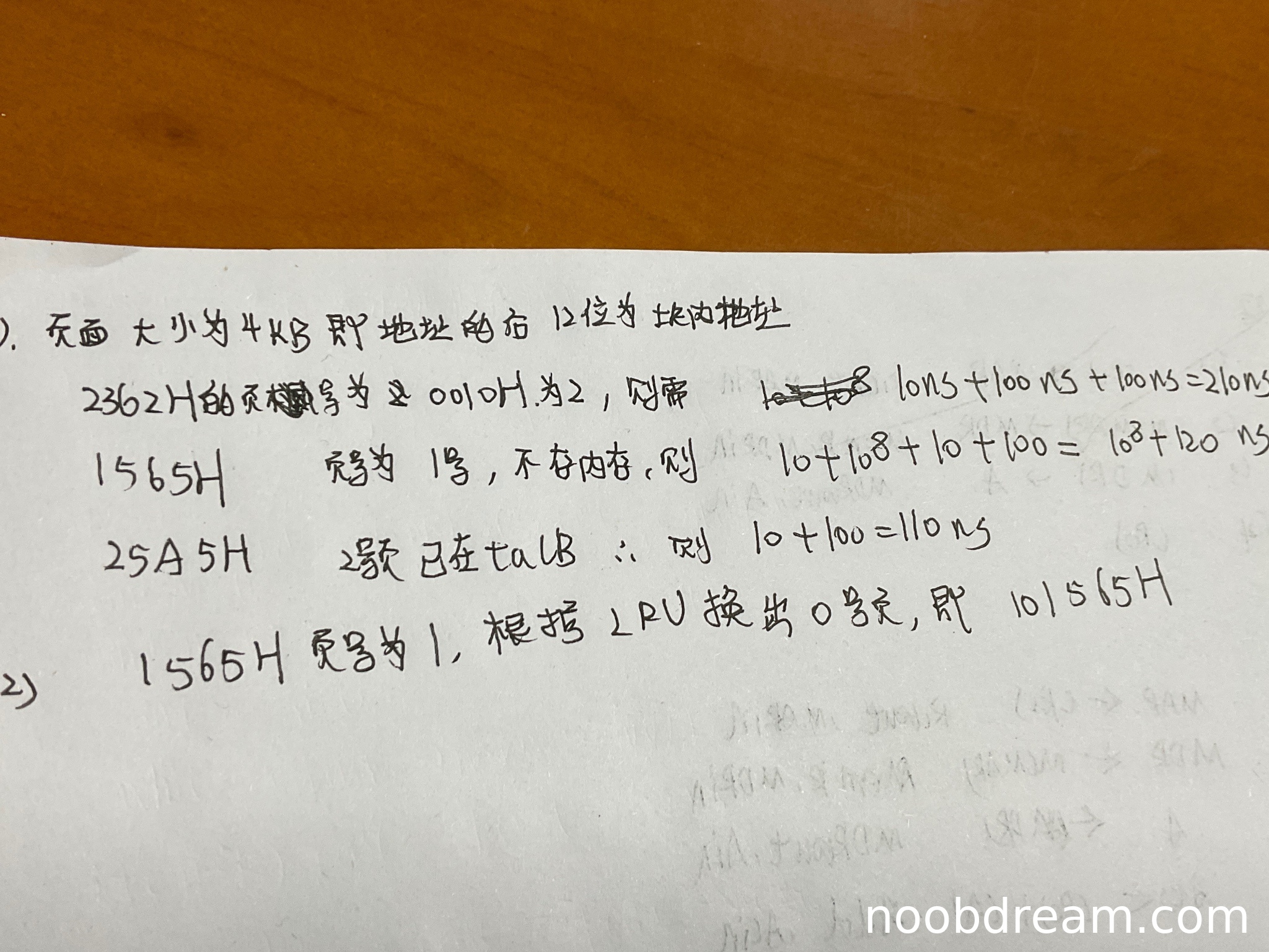 - 对于虚地址1565H:学生两次识别的计算过程均为“10ns + 10^8 ns + 10ns + 100ns”(第二次识别中的“108”根据上下文判断为“10^8”的误写),但计算结果写成了“10^8 + 120ns”。标准答案为“10ns+100ns+10^8 ns+10ns+100ns=100 000 220ns”。学生的计算过程包含了访问TLB(10ns)、访问页表(100ns)、处理缺页(10^8 ns)、再次访问TLB(10ns)、访问内存(100ns)这几个关键步骤,思路完全正确。计算结果“10^8 + 120ns”虽然表达式不规范,但数值上等于100,000,120ns,与标准答案100,000,220ns相差100ns。这个差异是因为学生漏算了第一次访问页表的100ns时间(过程写了,但求和时漏掉)。这是一个逻辑错误,应扣1分。