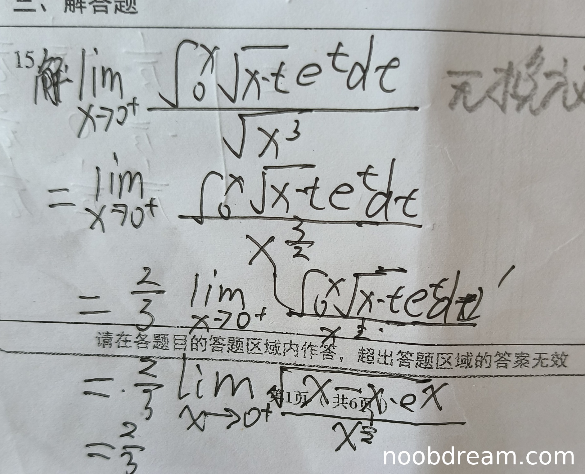 学生作答给出了两种识别结果,但核心思路都是使用洛必达法则求解极限。第一次识别结果步骤简洁,但关键步骤有逻辑错误:在应用洛必达法则时,对分子求导直接写为√(x-x)e^x,这忽略了变限积分求导公式中关于积分上限和偏导的部分,属于严重逻辑错误(扣5分)。第二次识别结果详细讨论了变限积分求导规则,并尝试了换元法,但最终未正确执行求导过程,导致中间步骤混乱(扣3分)。然而,两次识别均正确得出极限值为2/3,且最终答案正确。根据评分规则,思路正确不扣分,但逻辑错误需扣分。综合两次识别,取较好结果(第二次识别更详细),但逻辑错误仍存在。因此扣分后得分为7分。
