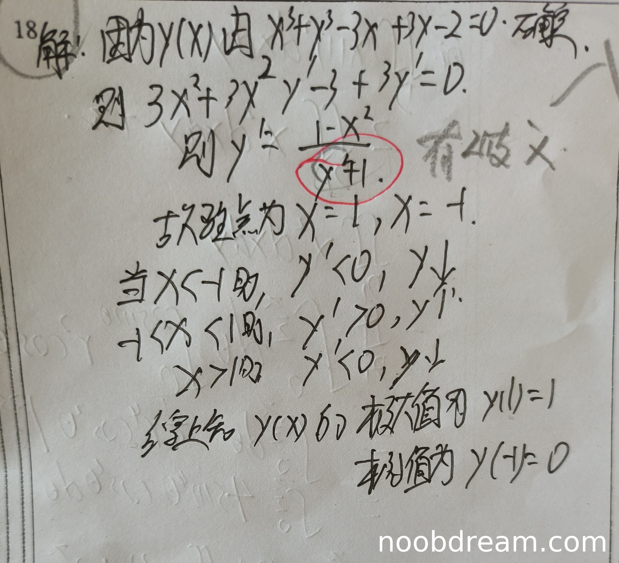 第1次识别结果中,求导写为“3x²+3x²y'-3+3y'=0”,存在明显错误(多写一个x²),但第2次识别结果正确写出“3x²+3y²y'-3+3y'=0”。根据规则“两次识别中只要有一次正确则不扣分”,且第2次正确,故不扣分。得2分。