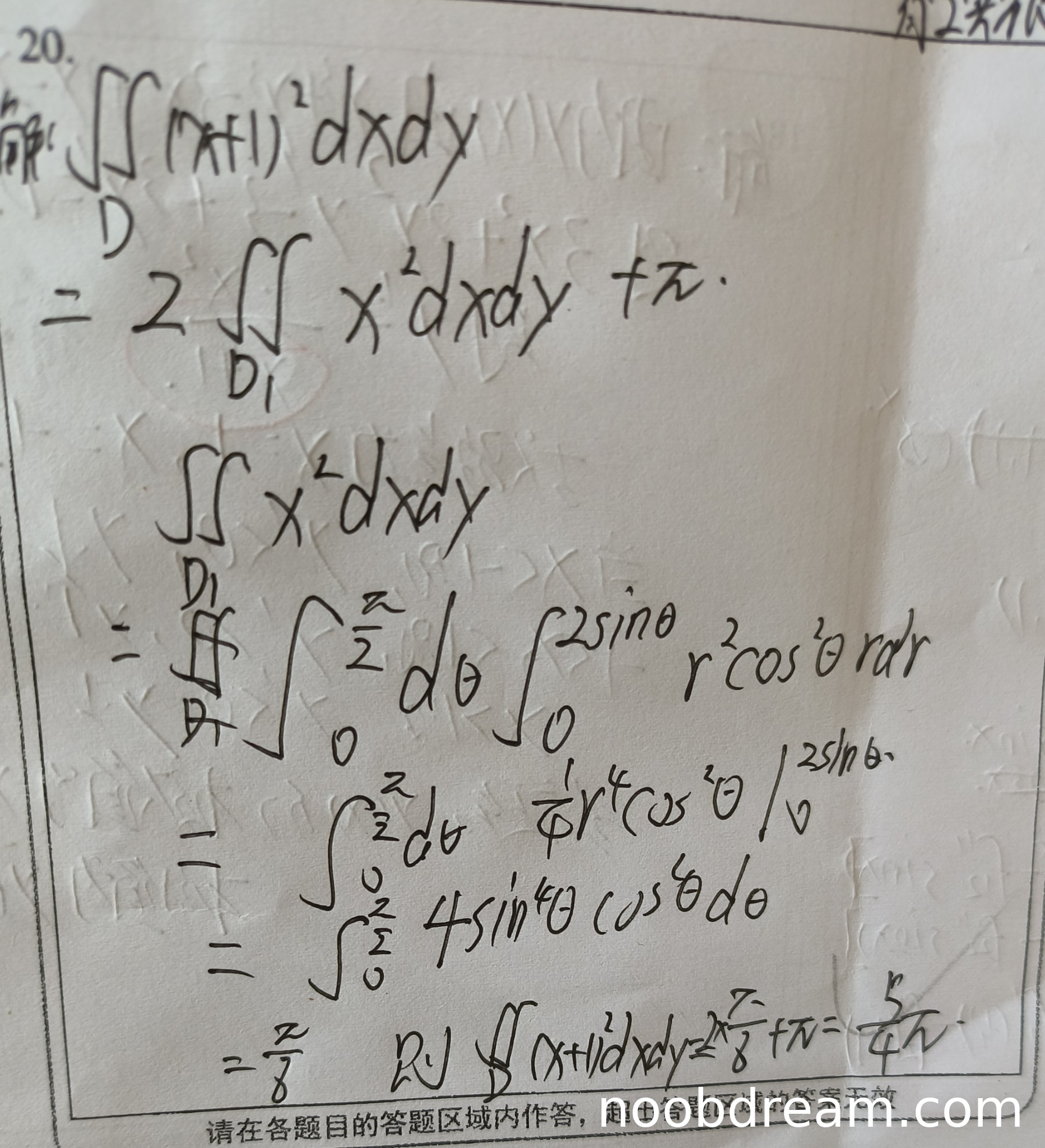 - 第一次识别:学生将原积分写为 \(2\iint_{D_{1}}x^{2}dxdy+\pi\),但未说明 \(D_1\) 的定义(应为右半区域)。计算 \(\iint_{D_1} x^2 dxdy\) 时,积分限 \(\theta\) 错误地取为 \([0, \frac{\pi}{2}]\)(正确应为 \([0, \pi]\) 或利用对称性取 \([0, \pi]\) 的一半),导致后续计算错误(得到 \(\frac{\pi}{8}\)),最终结果 \(\frac{9\pi}{8}\) 错误。此处有逻辑错误(积分区域范围错误)和计算错误,扣分。