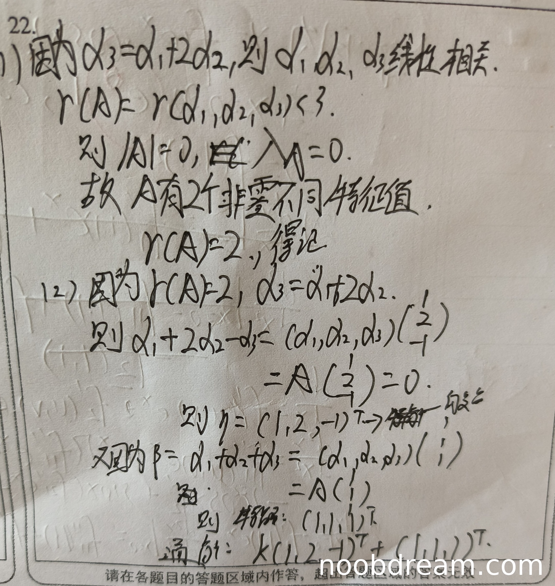 学生两次识别结果在(I)部分的核心逻辑正确:由α₃=α₁+2α₂得出α₁,α₂,α₃线性相关,从而|A|=0,说明0是特征值。结合A有三个不同特征值,得出A的秩为2。