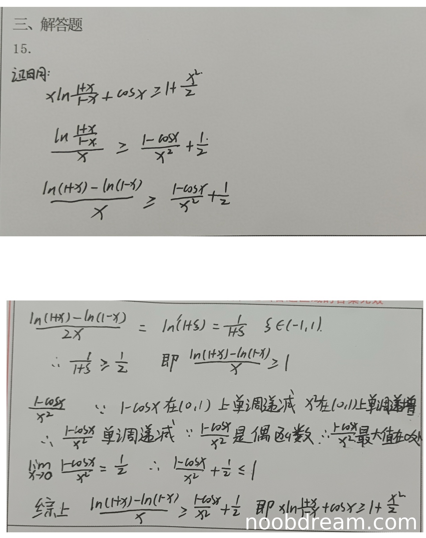 - 最终推导中,由 \(\frac{\ln(1+x)-\ln(1-x)}{x} \geq 1\) 和 \(\frac{1-\cos x}{x^2} + \frac{1}{2} \leq 1\) 直接推出不等式,逻辑跳跃(需严格说明两项大小关系,但学生未建立直接联系)。