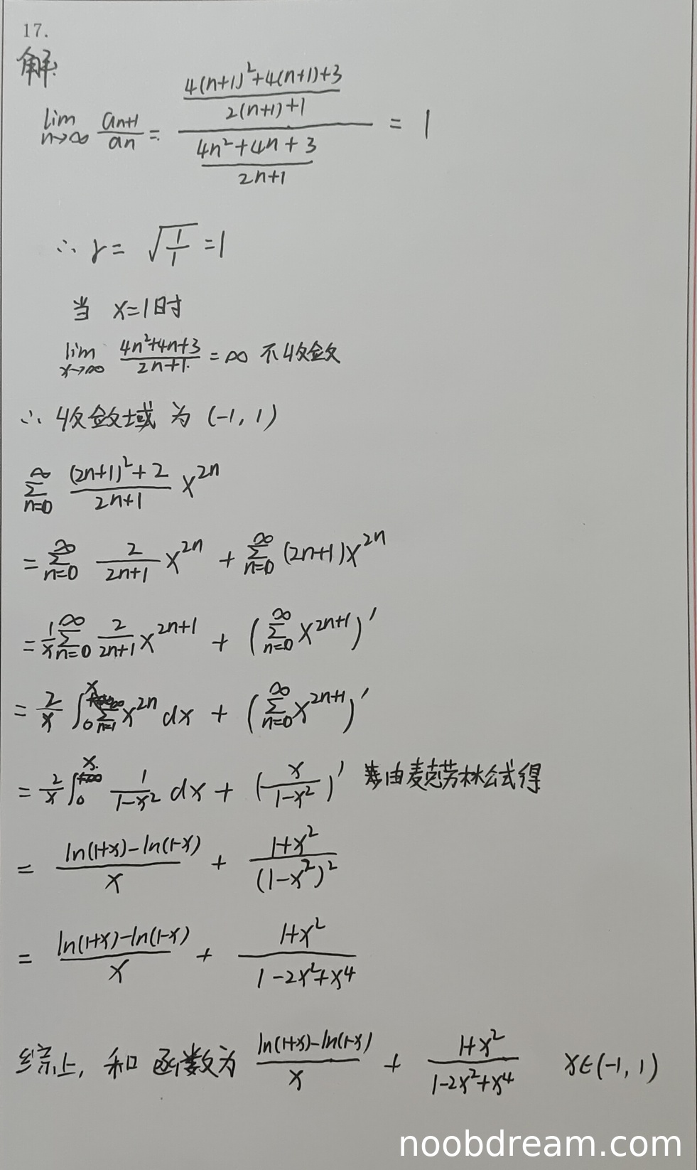 理由:学生正确计算了收敛半径r=1,并检验了端点x=1和x=-1处的发散性,得出收敛域为(-1,1)。虽然第一次识别中极限计算步骤较简略,但第二次识别给出了详细计算过程。思路和结果均正确。