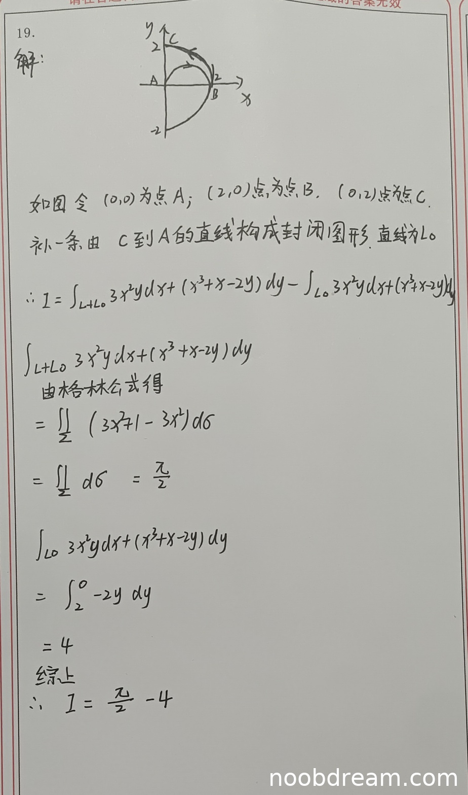 学生作答与标准答案思路一致:补线构成封闭曲线,应用格林公式,计算区域面积和补线上的积分。具体步骤: