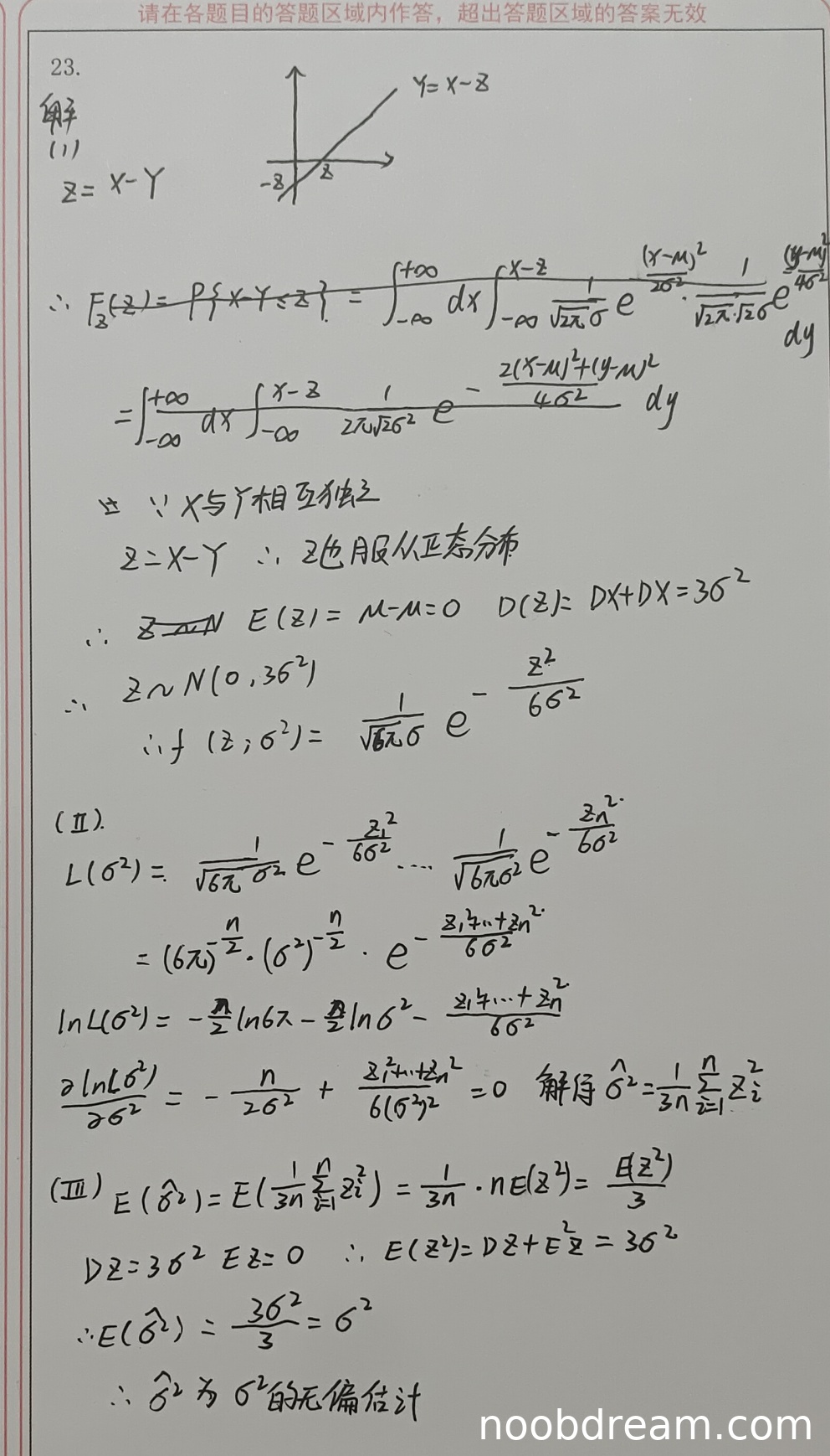 第2次识别:学生方差计算错误为“36²”(应为3σ²),概率密度函数形式错误(使用了标准正态密度形式)。存在逻辑错误。得1分。