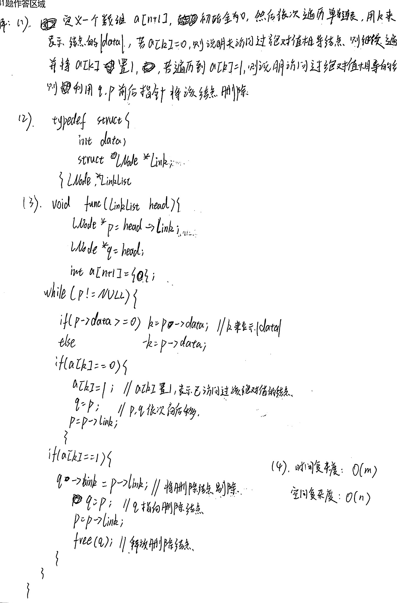 理由:学生的基本设计思想与标准答案一致,都是使用辅助数组记录已出现的绝对值,通过一趟扫描链表来实现删除重复绝对值结点的功能。思路正确,描述清晰。