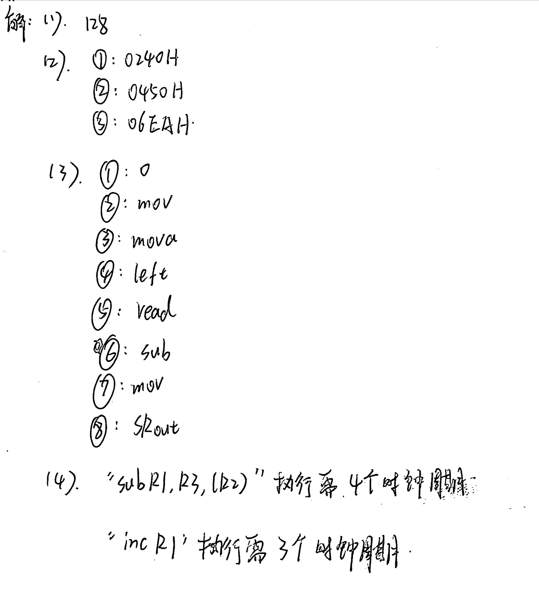 学生答案中,“sub R1, R3, (R2)”的执行周期为4个,与标准答案一致。但“inc R1”的执行周期,学生两次识别结果均为3个,而标准答案为2个。根据图a,inc指令执行阶段仅需“ALU运算”和“结果写回寄存器”两个步骤,学生答案存在逻辑错误。因此,“inc R1”部分错误。两个小问答对一个,扣1分。得1分。