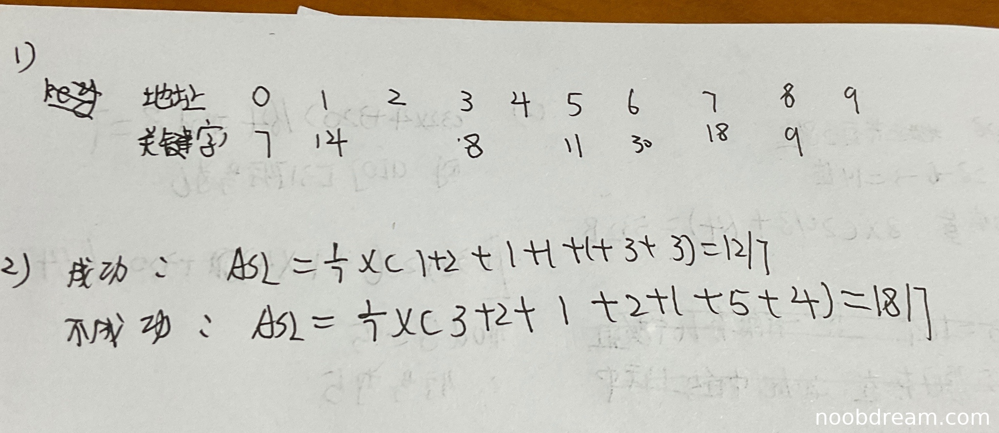 虽然散列表构造错误,但ASL计算基于学生自己构造的散列表(隐含线性探测过程)得出的数值与标准答案巧合一致,且计算过程正确。根据评分原则“思路正确不扣分”,本小题不因散列表错误而扣分,但需注意ASL计算依赖于散列表结构,学生实际计算可能基于错误结构,但数值结果正确,故给予满分。