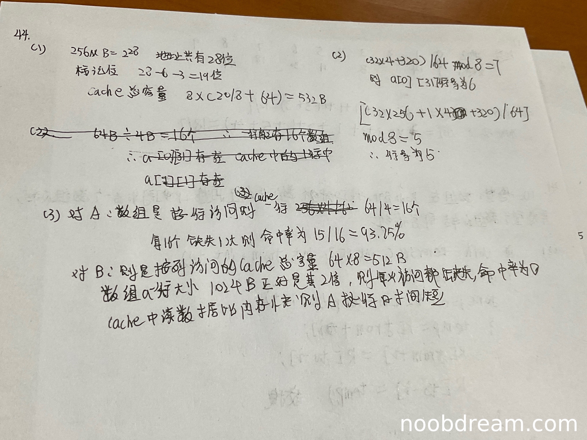 学生答案正确分析了程序A和B的访问模式,命中率计算正确(93.75%和0%),并正确指出程序A执行时间更短。与标准答案一致。得5分。