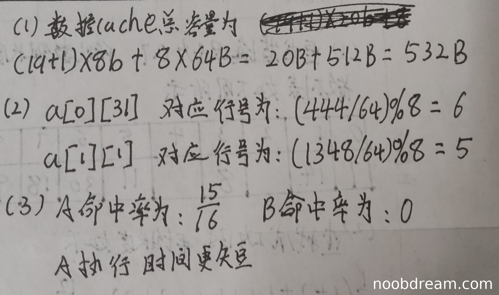 学生答案正确给出了程序A的命中率为15/16(93.75%),程序B的命中率为0,并正确判断程序A执行时间更短。理由与标准答案一致,命中率分析正确。得5分。