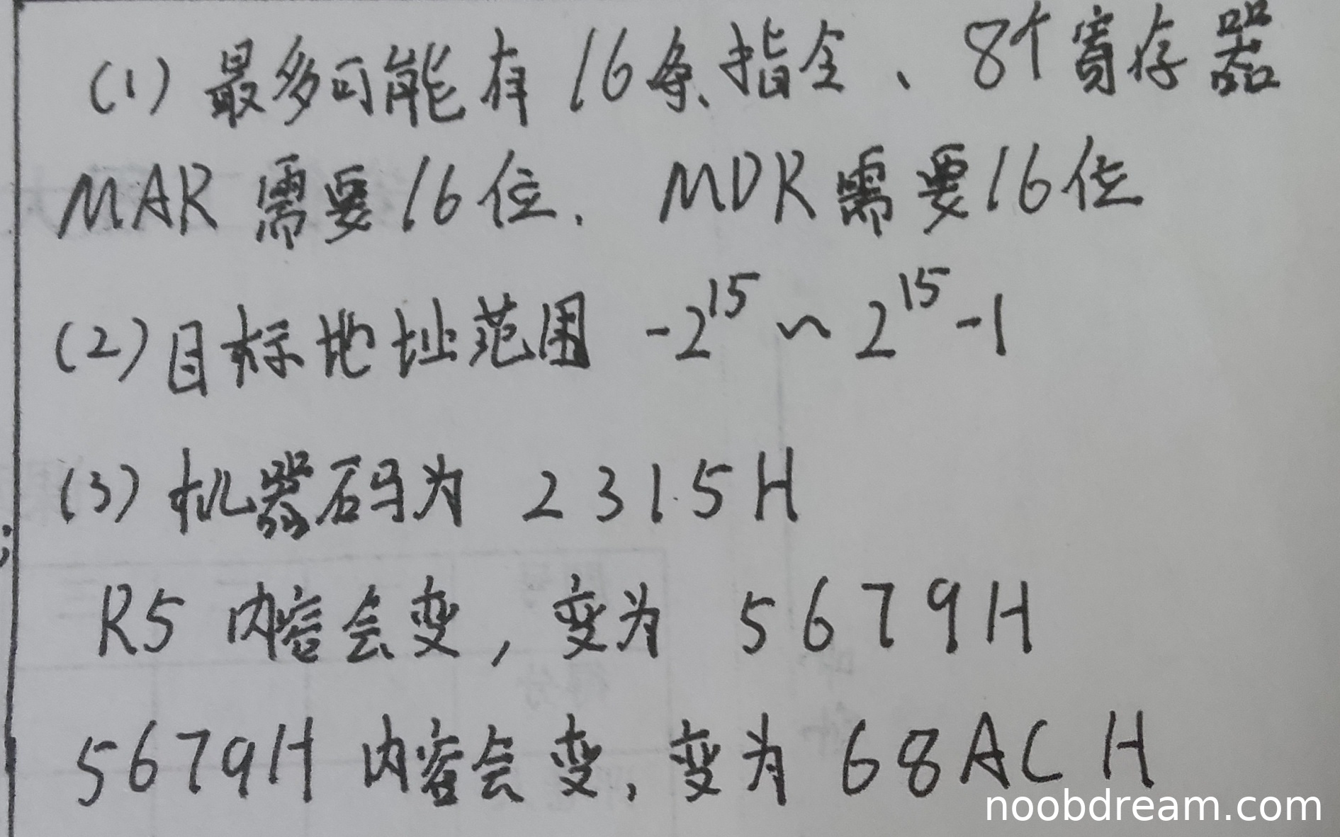 学生答案正确指出了机器码为2315H(与标准答案一致)。正确指出了R5的内容会改变为5679H(寄存器间接寻址后自增)。在指出哪个存储单元内容改变时,学生回答是“5679H”的内容变为68ACH。根据题目,目的操作数是(R5)+,其含义是:以R5的内容为地址访问内存(得到操作数),然后R5自增。因此,写入操作发生在R5自增前的地址,即5678H。学生将地址误写为5679H,这很可能是一个笔误或识别错误(因为前面正确写出了R5变为5679H,说明其理解自增操作)。根据“误写不扣分”的原则,此处的地址错误不扣分。该存储单元改变后的内容68ACH计算正确(1234H+5678H=68ACH)。源操作数(R4)是读取操作,其指向的地址1234H内容不会改变。因此,学生答案核心逻辑正确。得5分。