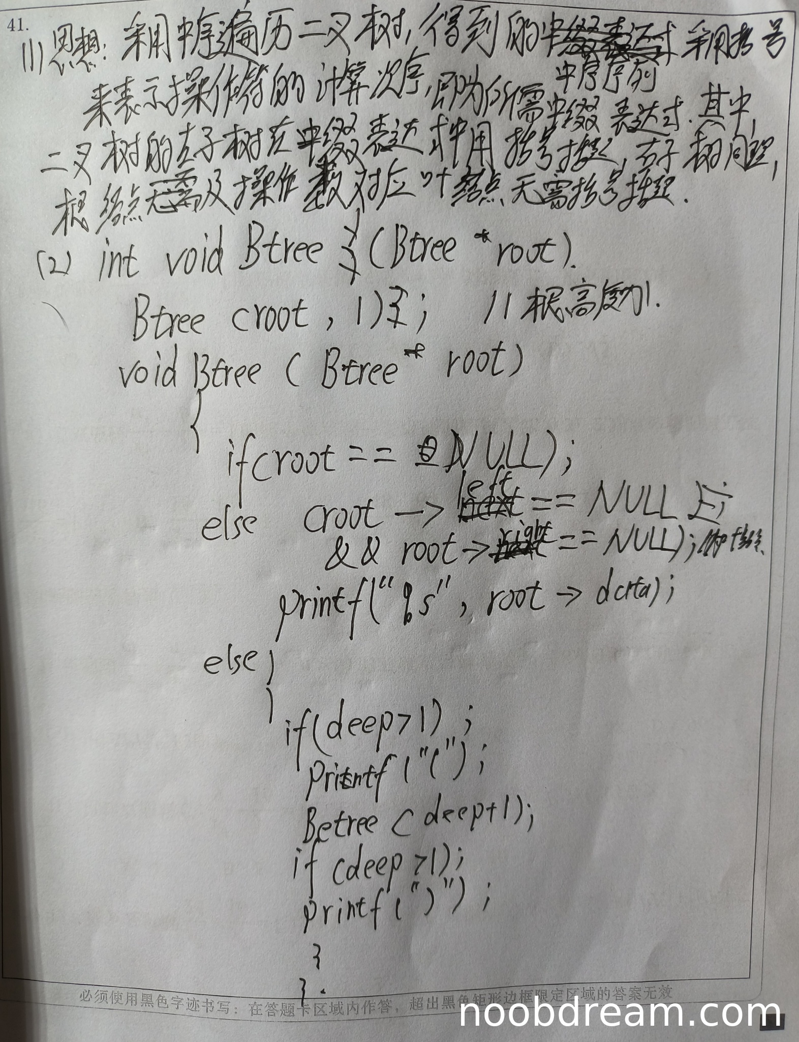 得分:2分(仅因识别出中序遍历和括号的基本想法给予部分分数)