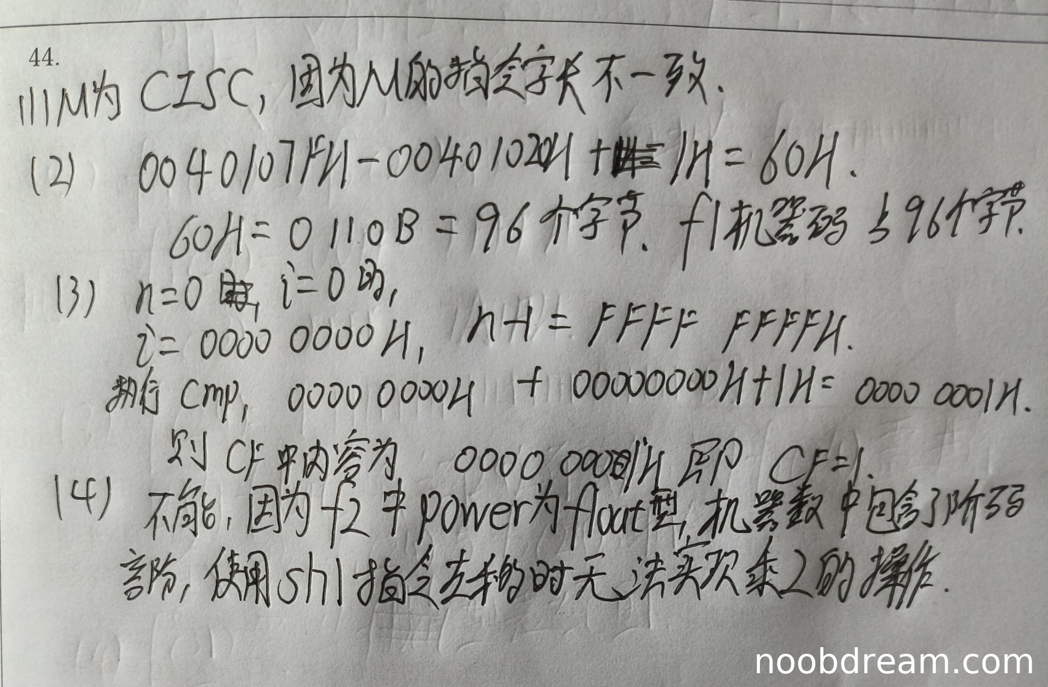 两次识别均正确分析n=0时i=0,n-1=FFFFFFFFH,减法操作转换为补码加法(0 + 0 + 1),并得出CF=1。但第一次识别中“CF中内容为0000 0000H”表述矛盾(实际应为CF=1),第二次识别纠正为“CF=1”。核心逻辑正确,表述瑕疵不扣分,得3分。