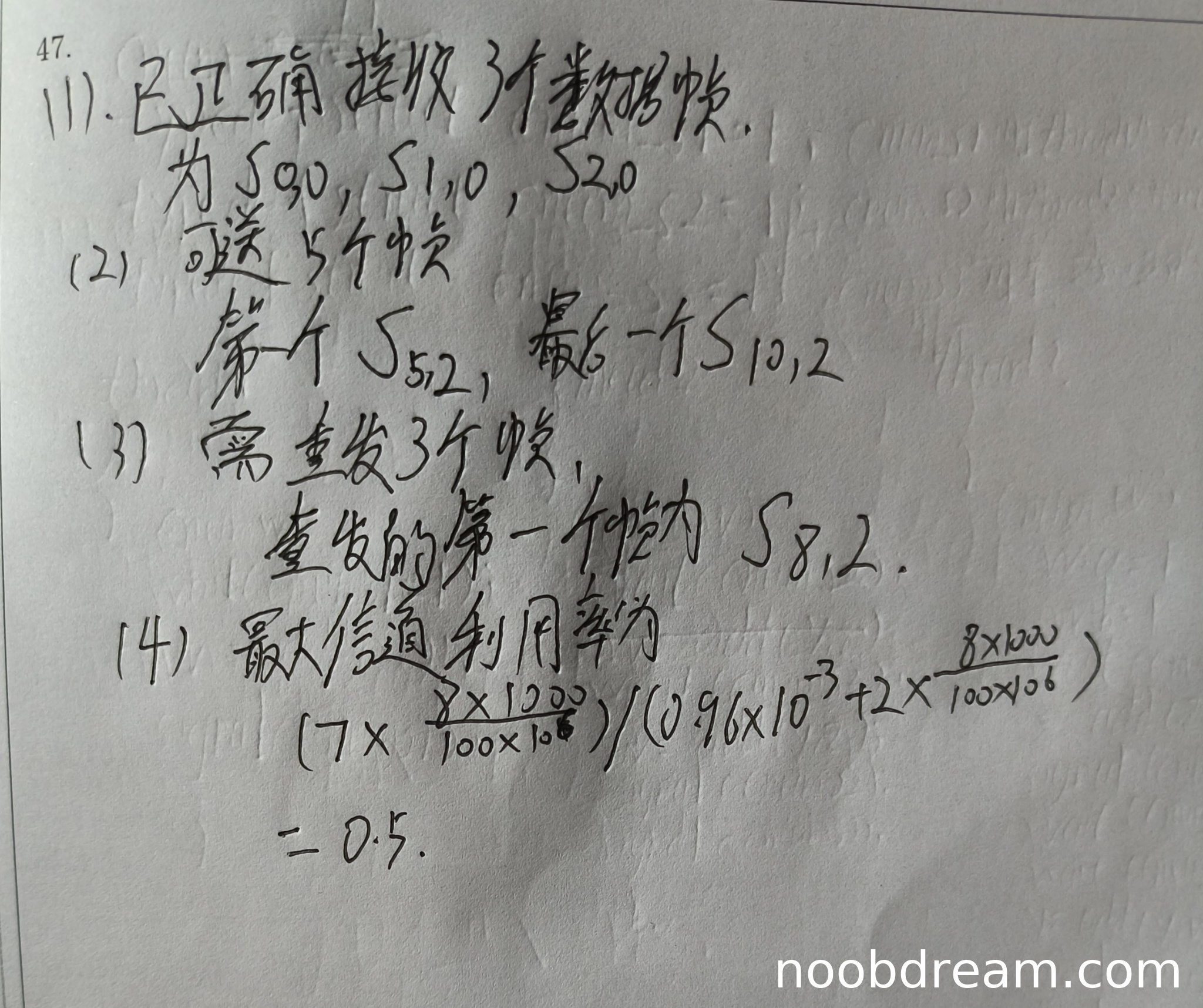第1次识别结果:计算公式正确,结果0.5(即50%)正确,但分子中帧长误写为1200(应为1000),可能是识别错误。第2次识别结果同样有帧长错误,但结果正确。根据“误写不扣分”原则,本题得满分。得分:1分