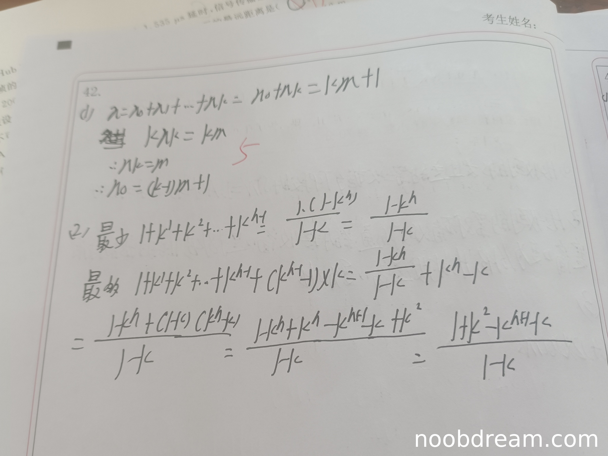 但学生将等比数列求和公式计算的结果标注为"最少",而将错误的扩展计算标注为"最多",这是根本性的逻辑错误。虽然计算过程显示学生掌握了等比数列求和,但对正则k叉树极端情况的理解完全错误。根据评分标准,推导过程存在逻辑错误不能给满分,且答案完全颠倒,因此最多结点部分得1分(公式正确但应用对象错误),最少结点部分得0分(公式和理解均错误)。本题总得1分。