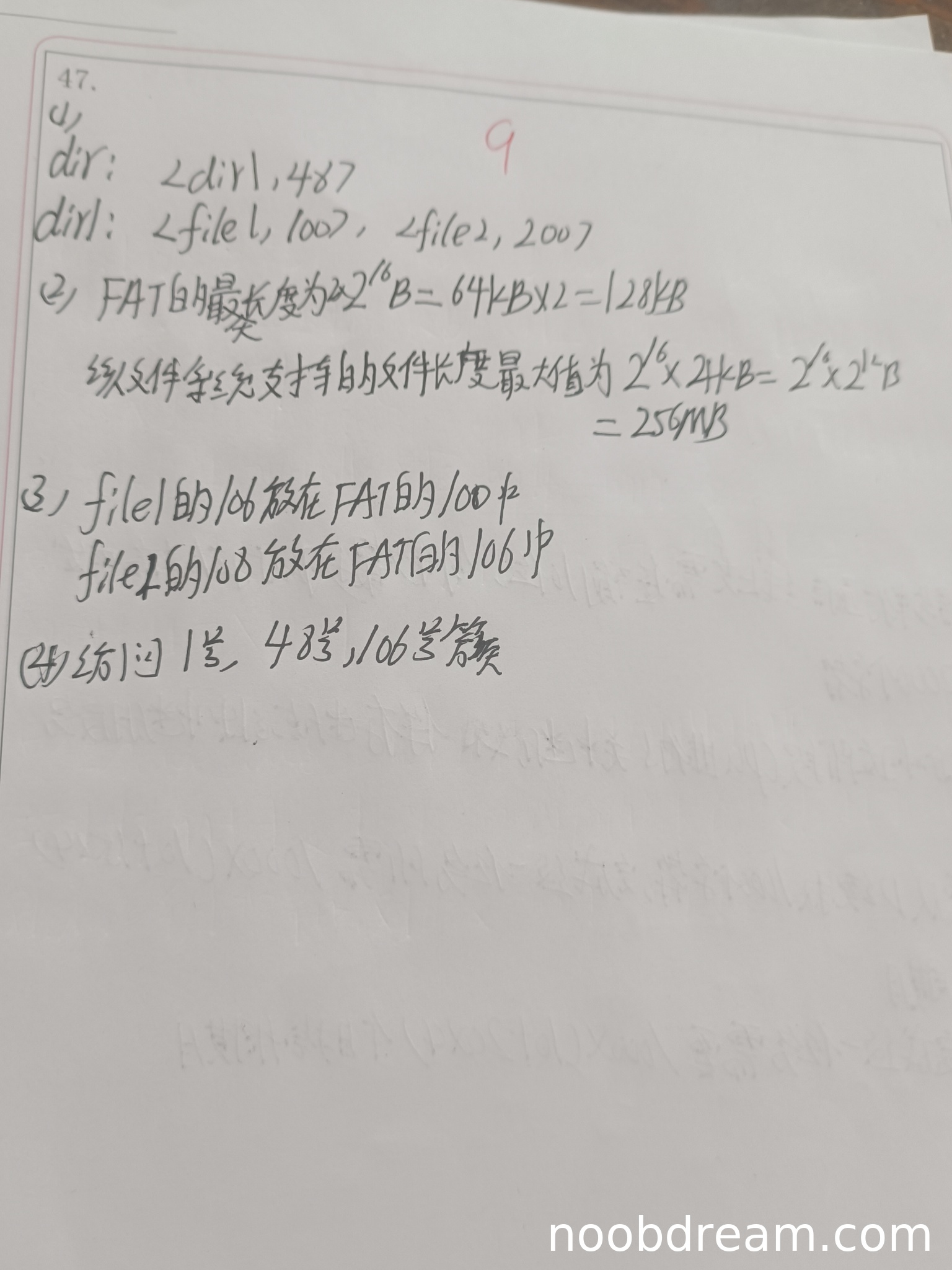 学生答案正确计算出FAT的最大长度为128KB,文件最大长度为256MB。虽然第二次识别结果中文件长度计算过程写为$2^{16}\times4KB=2^{16}\times2^{12}B = 256MB$,其中$2^{12}$应为$2^{12}B=4KB$,但最终结果正确,且可能是识别或书写笔误,根据规则不扣分。因此,该部分得分为2分。