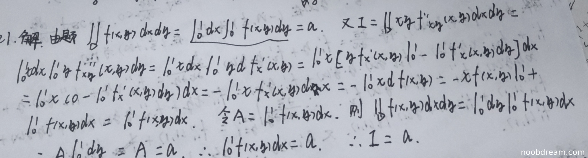 - 将原积分 \( I = \iint_{D} xyf_{xy}''(x,y)dxdy \) 误写为 \( I = \iint_{D} xy + f_{xy}'(x,y) dxdy \),这是一个根本性的错误,改变了被积函数的结构。